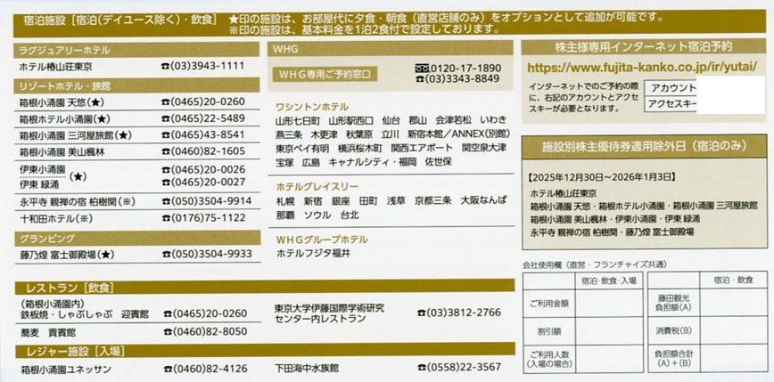 即決!藤田観光 株主優待券 複数あり 宿泊50%引き 飲食20%引き レジャー施設入場50%引き 椿山荘 箱根小涌園 1枚/2枚/3枚/4枚/5枚/6枚