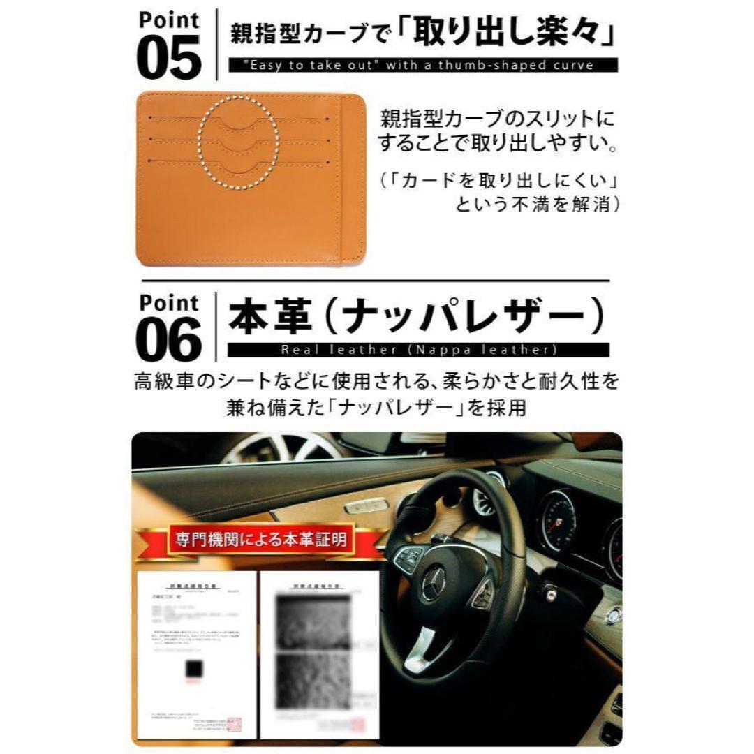 高級ナッパレザーを使用した滑らかな質感が魅力。握りやすいサイズ感で、厚さわずか0.5cmの薄型設計。スーツやジーンズのポケットに入れても膨らまず、持ち運びもラクラク。