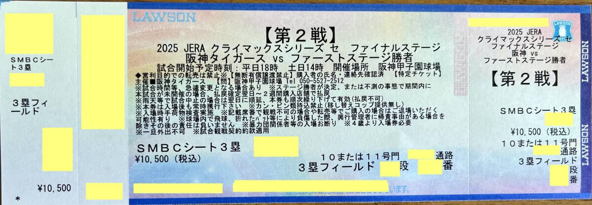 クライマックスシリーズ CS ファイナル 第2戦 阪神タイガースvsファーストステージ勝者 甲子園球場 SMBCシート3塁 A段~C段 1枚