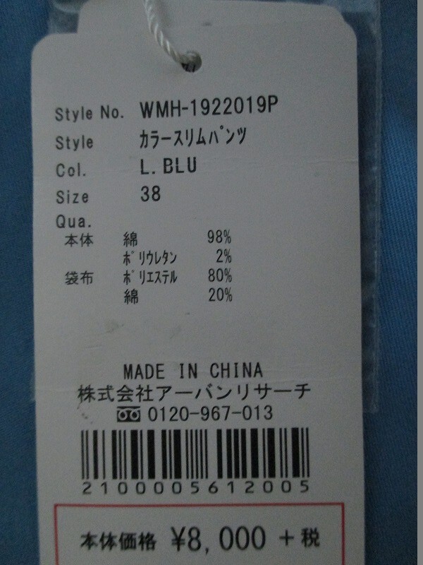 送料込 ウエスト約76cm 表記サイズ38 ライトブルー 定価8000円 アーバンリサーチ URBAN RESEARCH カラースリムパンツ ストレッチ 送料無料