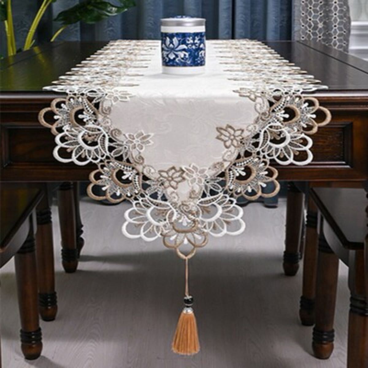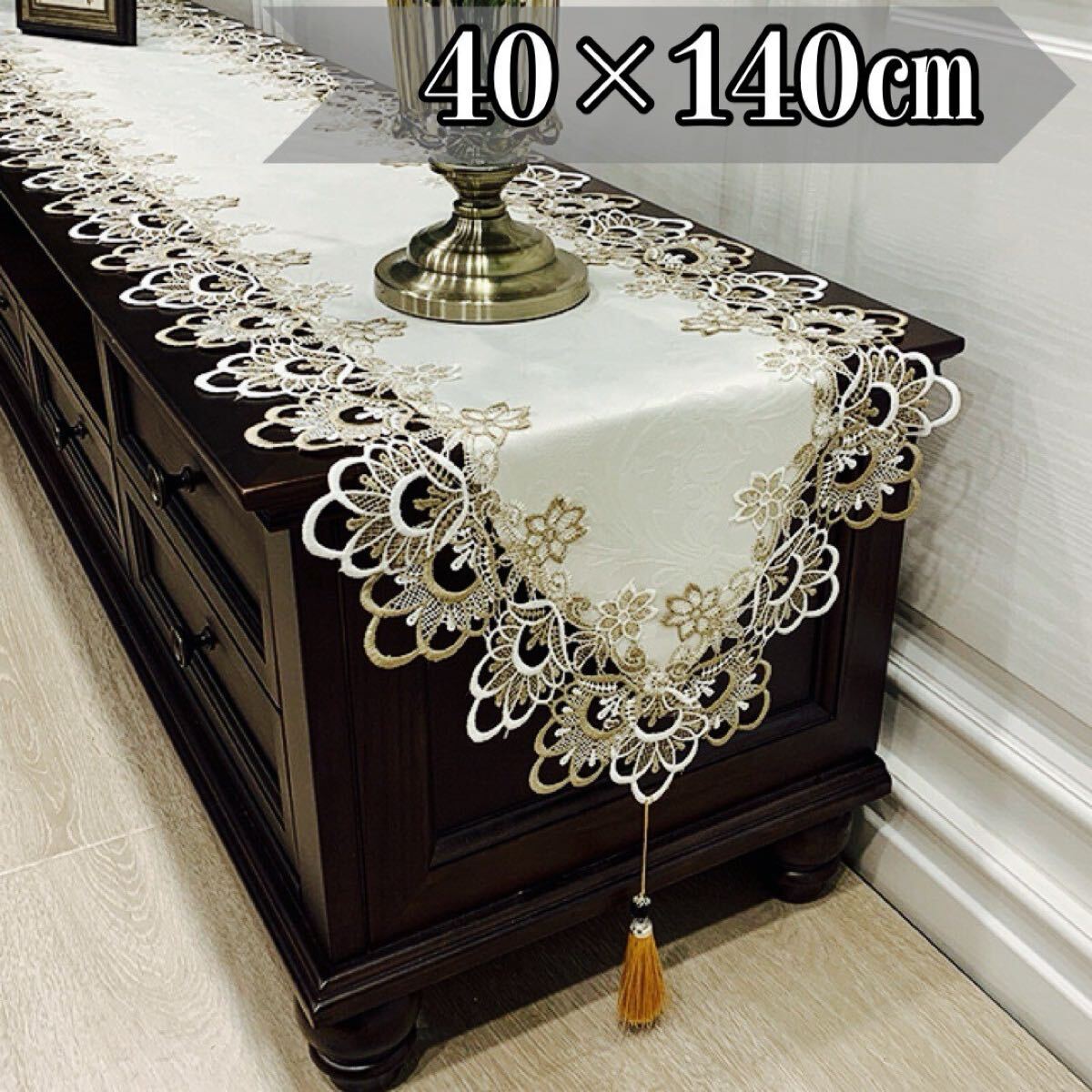 刺繍部分の透け感がテーブルの色を引き立て、両サイドのタッセルが上品な雰囲気を演出します。