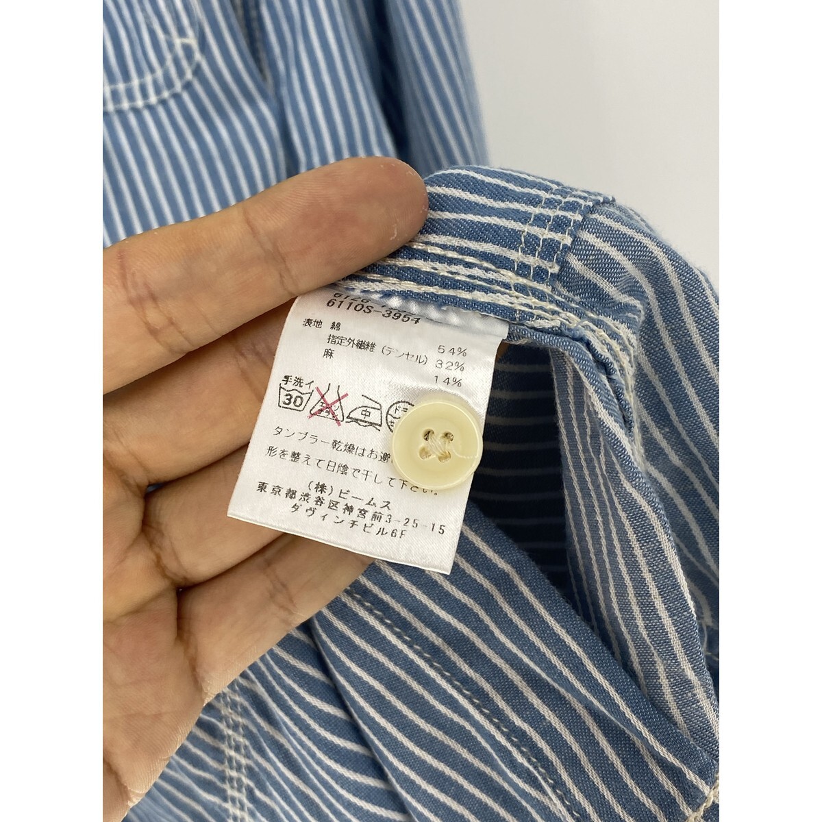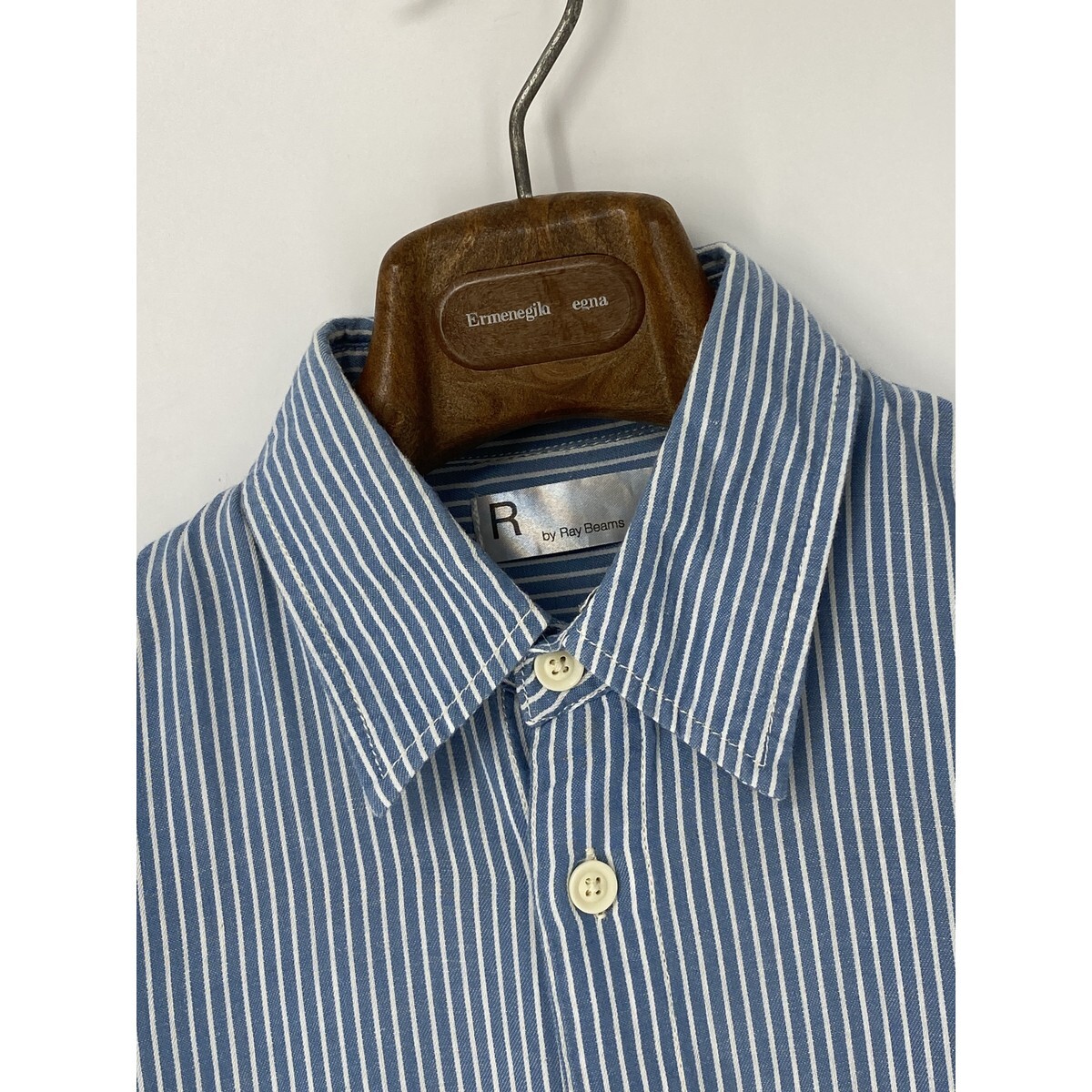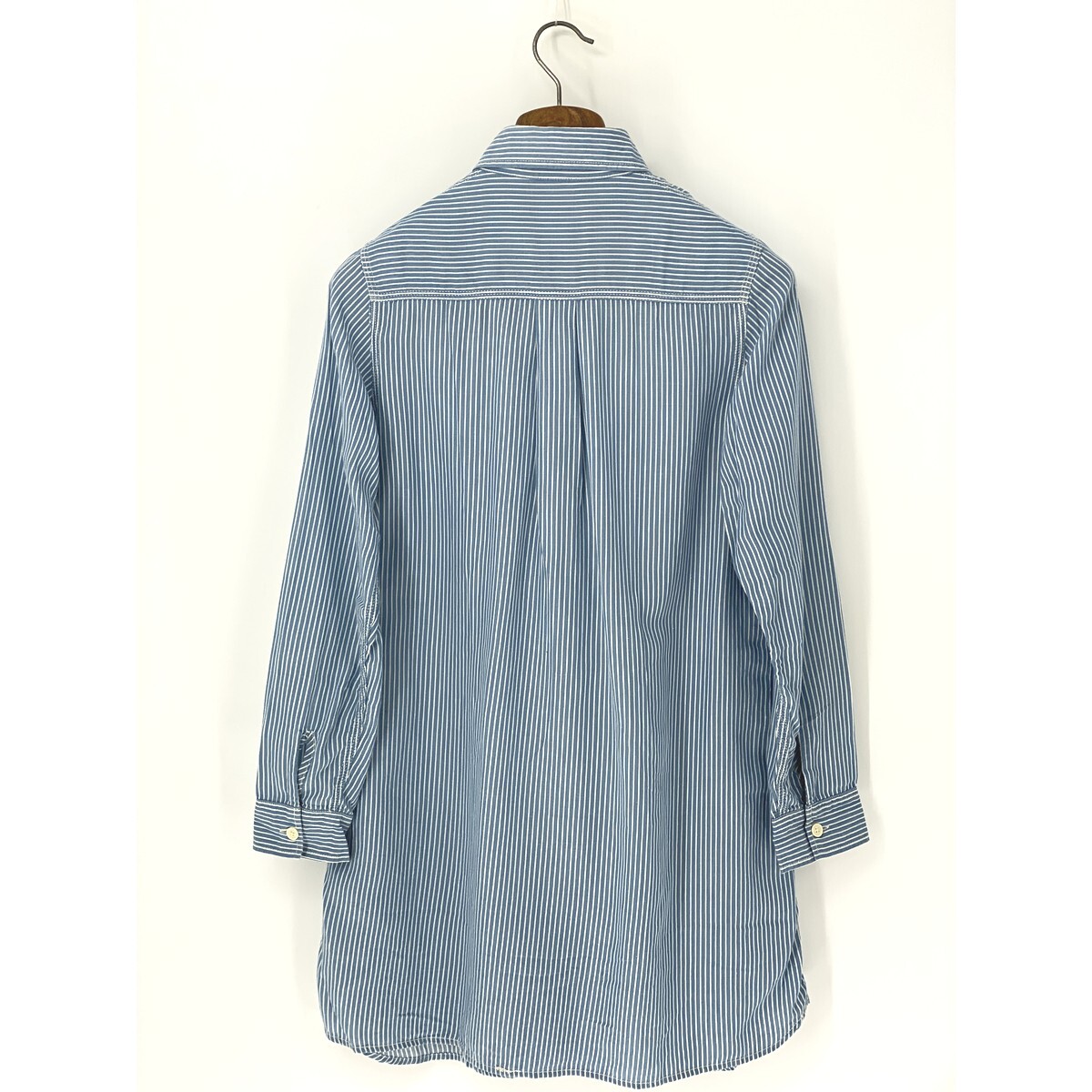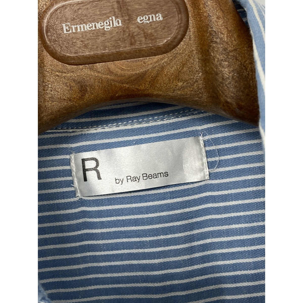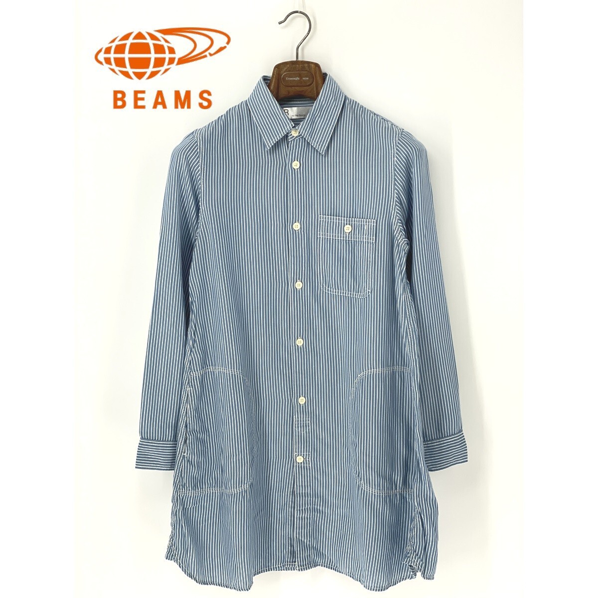 A9166/美品 春夏 Ray BEAMS レイ ビームス コットン リネン 長袖 ストライプ シャツ ワーク フレア 膝丈 ワンピース FREE 水色 レディース