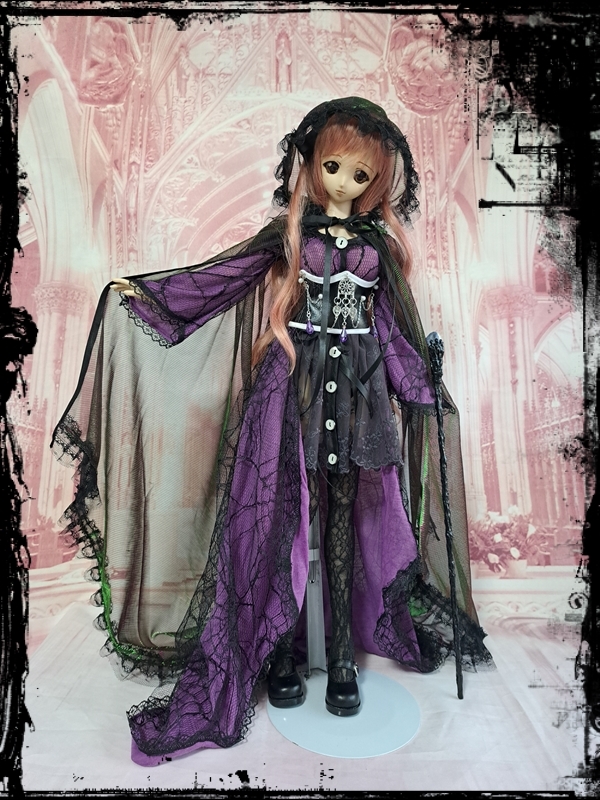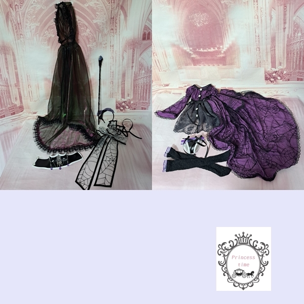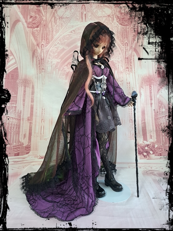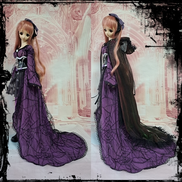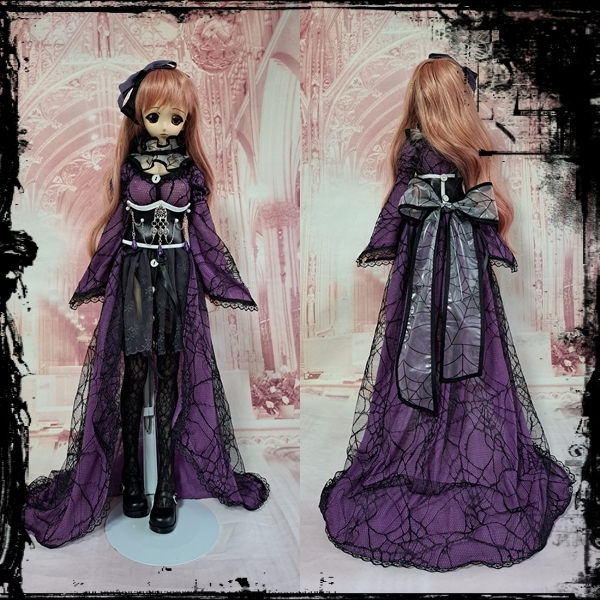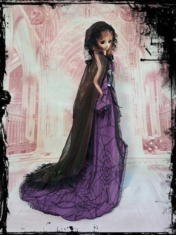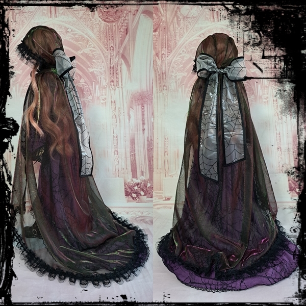 薄手の紫色の布と黒色のくもの巣柄レース、