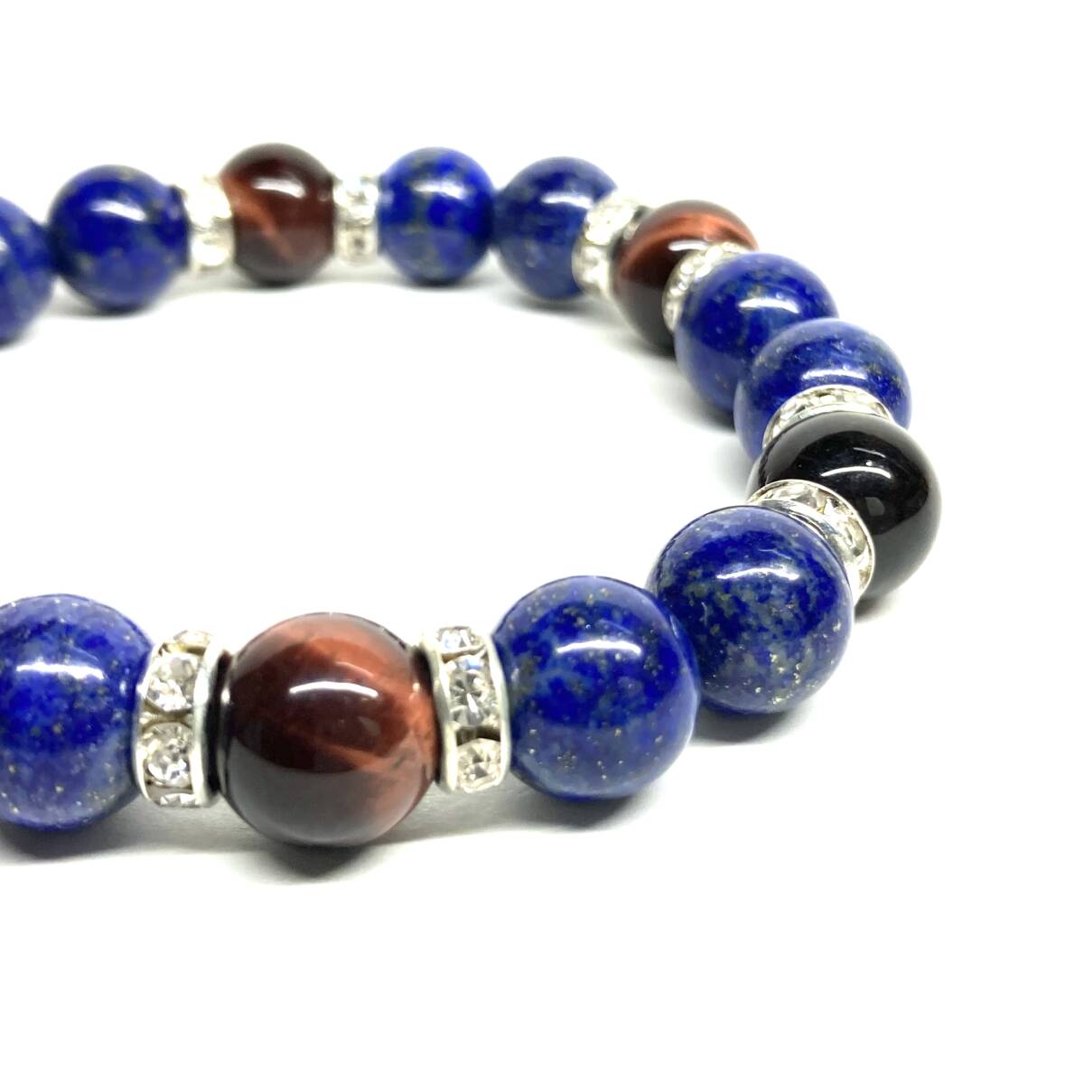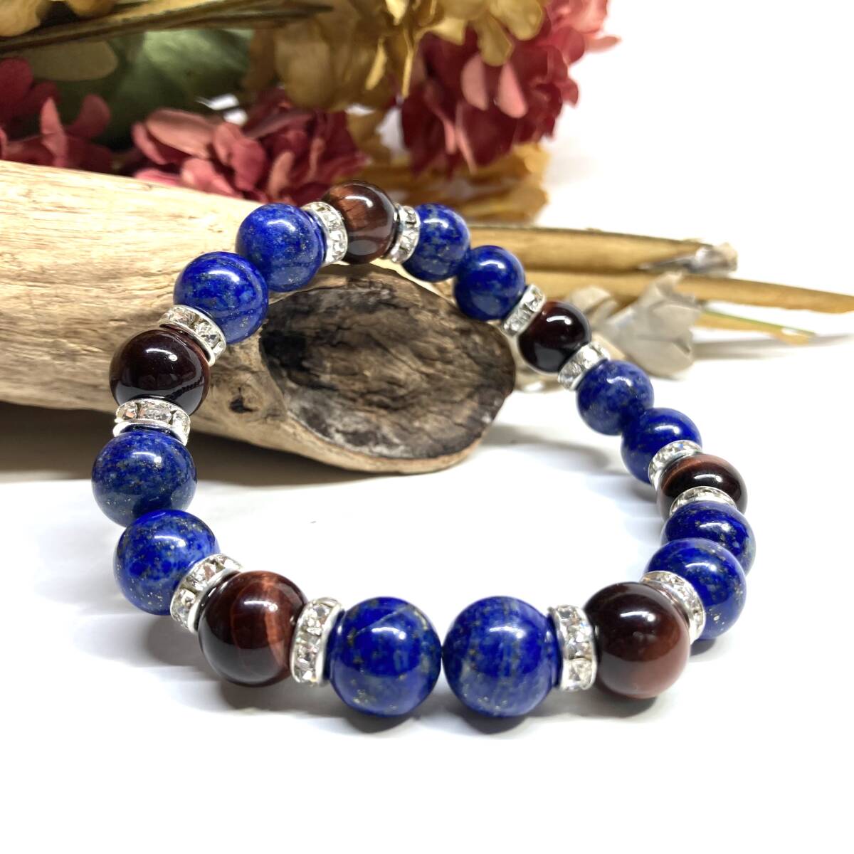 こちらは、ラピスラズリとレッドタイガーアイを組み合わせたパワーストーンブレスレットです。間にはロンデルを挟み高級感あるデザインに仕上げております。石大きさは腕にも馴染みやすいように10mm玉で内径約18cm(伸可能)です。(サイズ変更の場合は取引ナビにてご連絡をお願いします。) 数に限りがございますので気になる方はお早めにどうぞ。