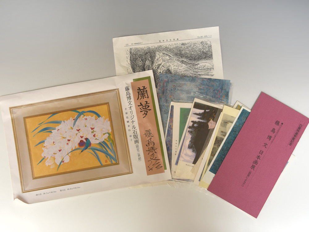 【真作】藤島博文 リトグラフ 手彩色「蘭夢」です。 あでやかな蘭が画面いっぱいに配された優美かつ幻想的な作品です。 平成5年、 ヤマナシ版画工房より200部限定で発行されました。 本作は116番です。 石版印刷に作者の手彩色が施された繊細な作品です。 画面上に署名落款有り。 作品に目立ったシミやスレなどなくコンディションは良好です。 付属額も綺麗な状態です。 日展特選受賞を記念した徳島で行われた日本画展のしおり、ほかオリジナルポストカードが多数付属します。 ※撮影の際に生じた写り込みなどがございます。 ご理解の程よろしくお願い致します。 |