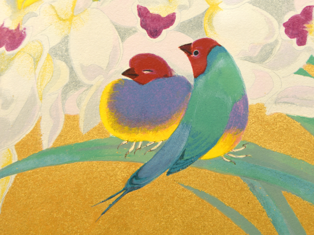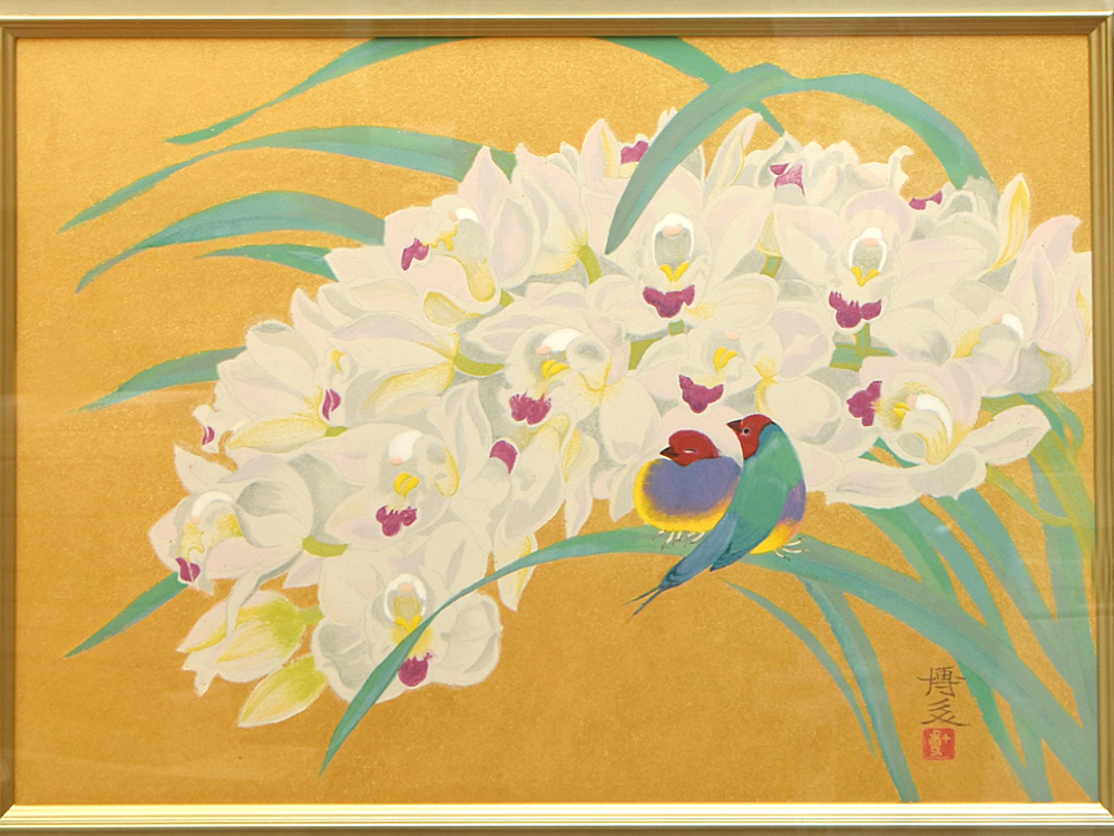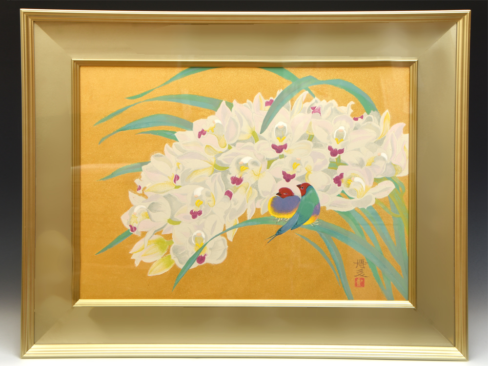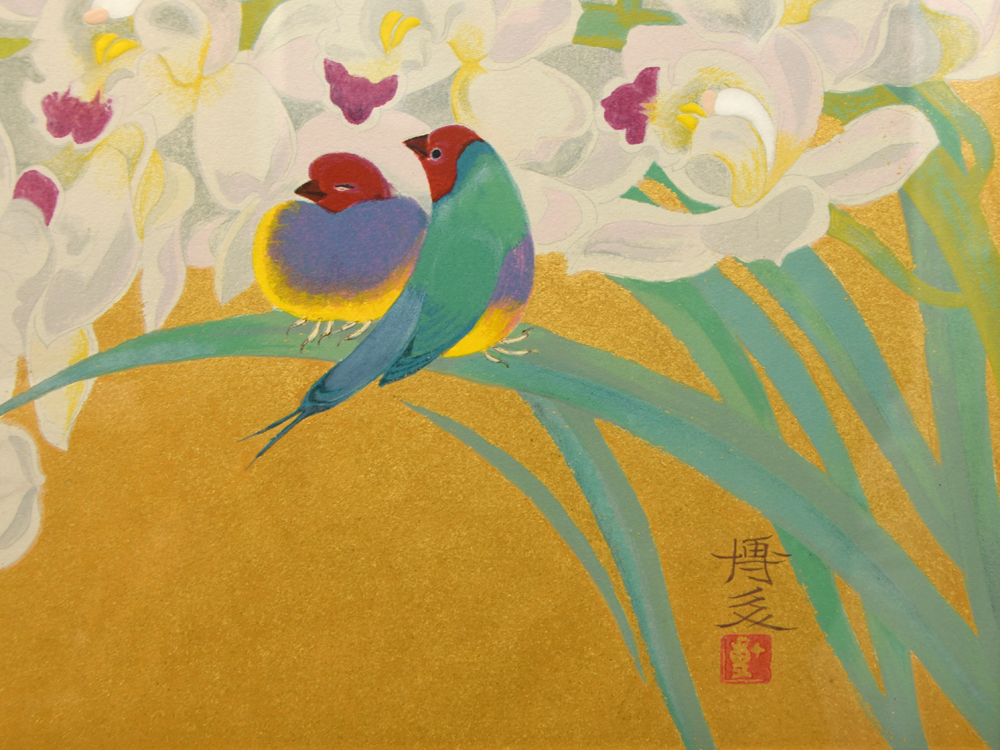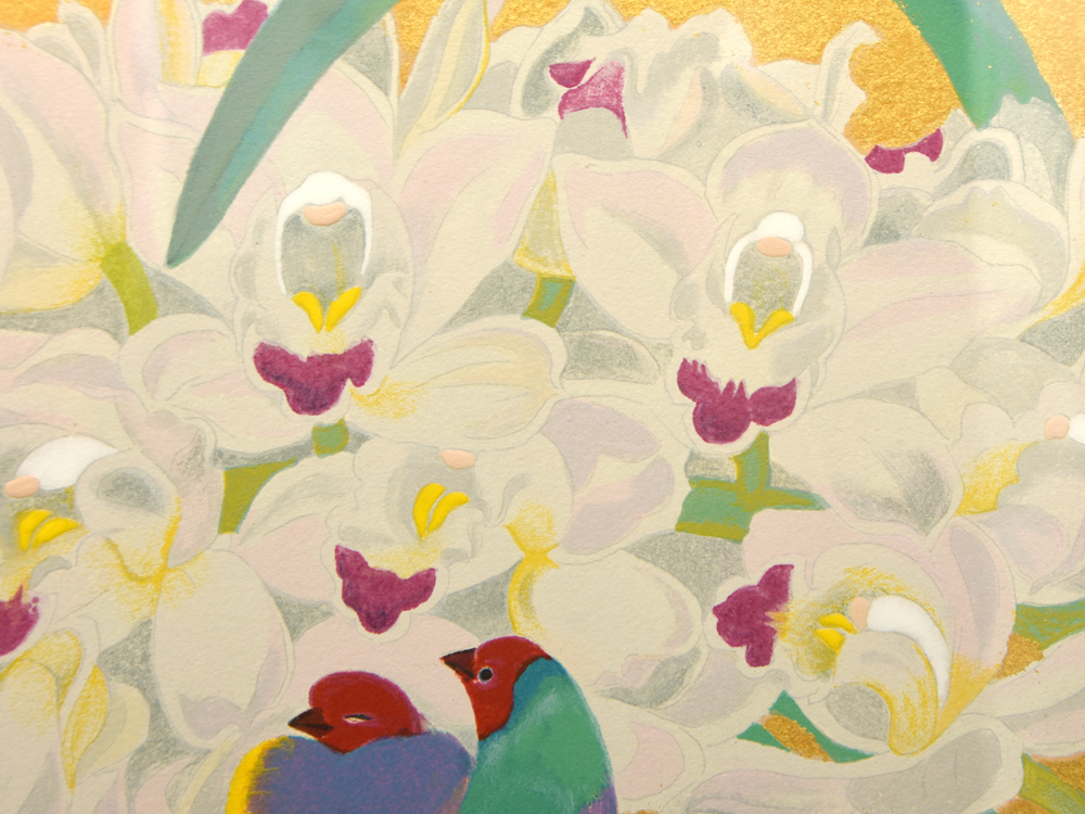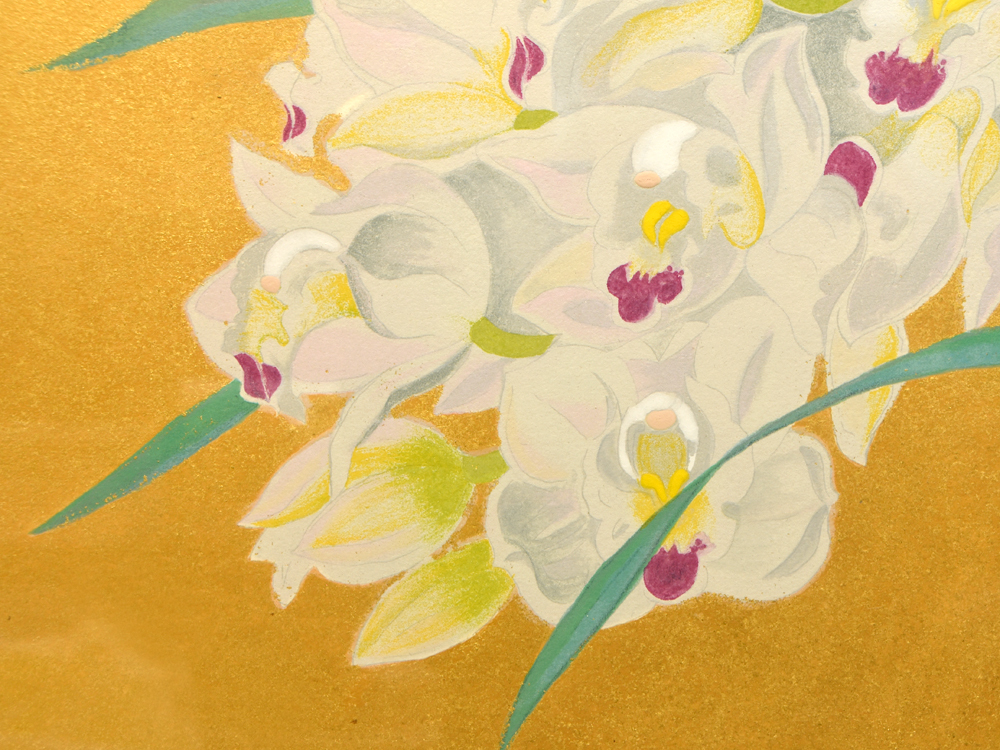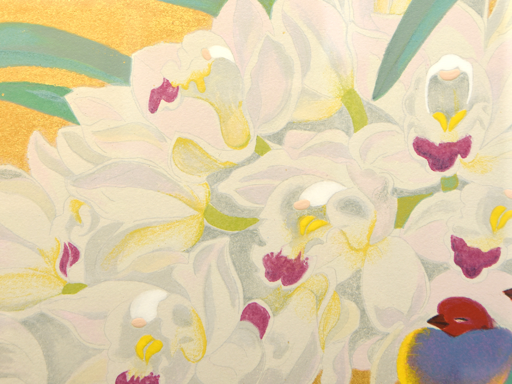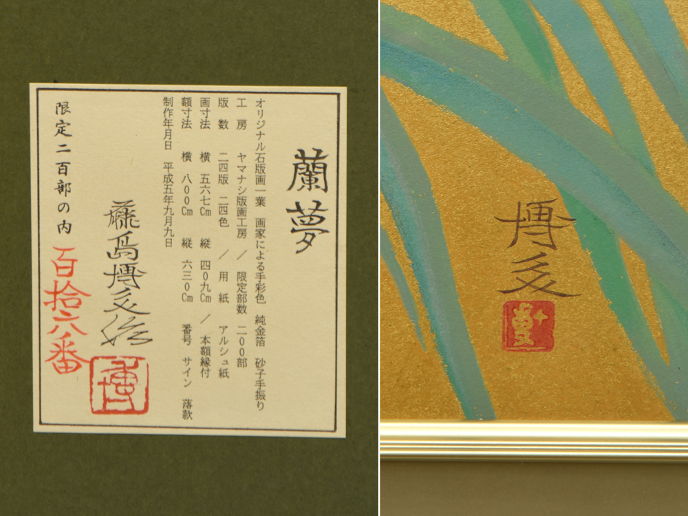 【真作】 藤島博文 リトグラフ 手彩色「蘭夢」116/200 ヤマナシ版画工房 平成5年 金箔 砂子手振り 日本画 絵画 |