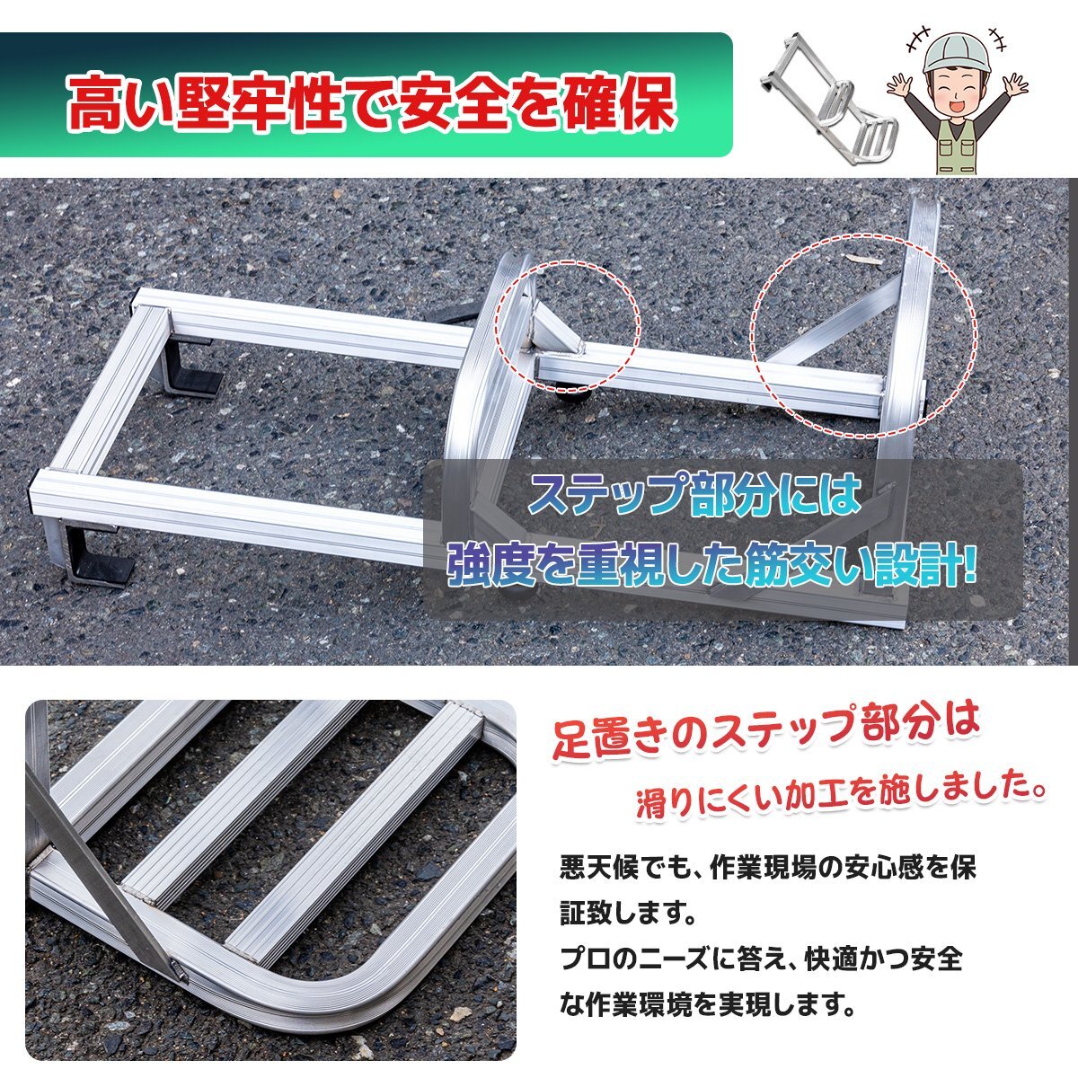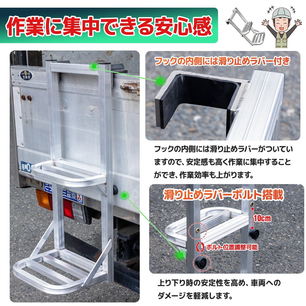 トラックのアオリや荷台に掛けるだけで、手軽に頑丈な足場が設置でき、荷物の搬入搬出作業に大変便利です。