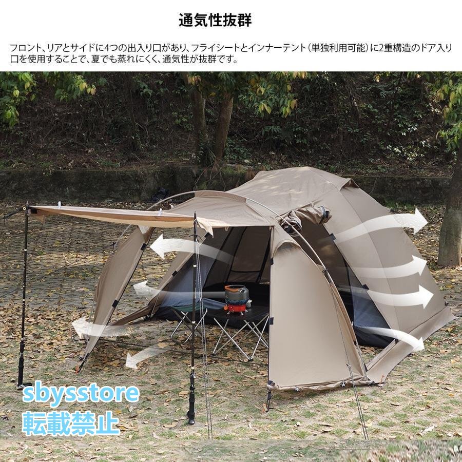 フロント、リアとサイドに4つの出入り口があり、フライシートとインナーテント(単独利用可能)に2重構造のドア入り口を使用することで、夏でも蒸れにくく、通気性が抜群です。