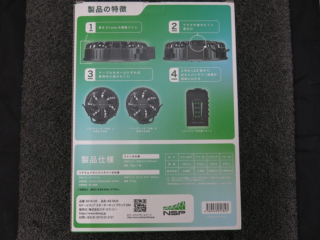 付属品元箱・取扱説明書・ファン×2・ケーブル・バッテリー・ACアダプタ・ウェア(ベスト)