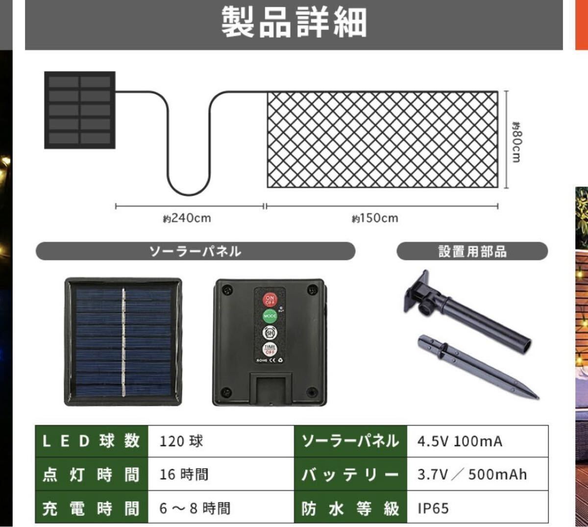 全長(約)ソーラーパネルから電飾まで2.4m/電飾ケーブル1.5×0.8m