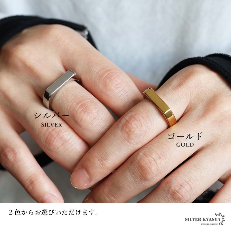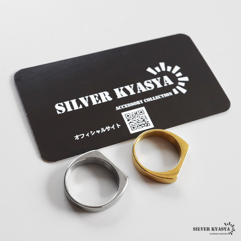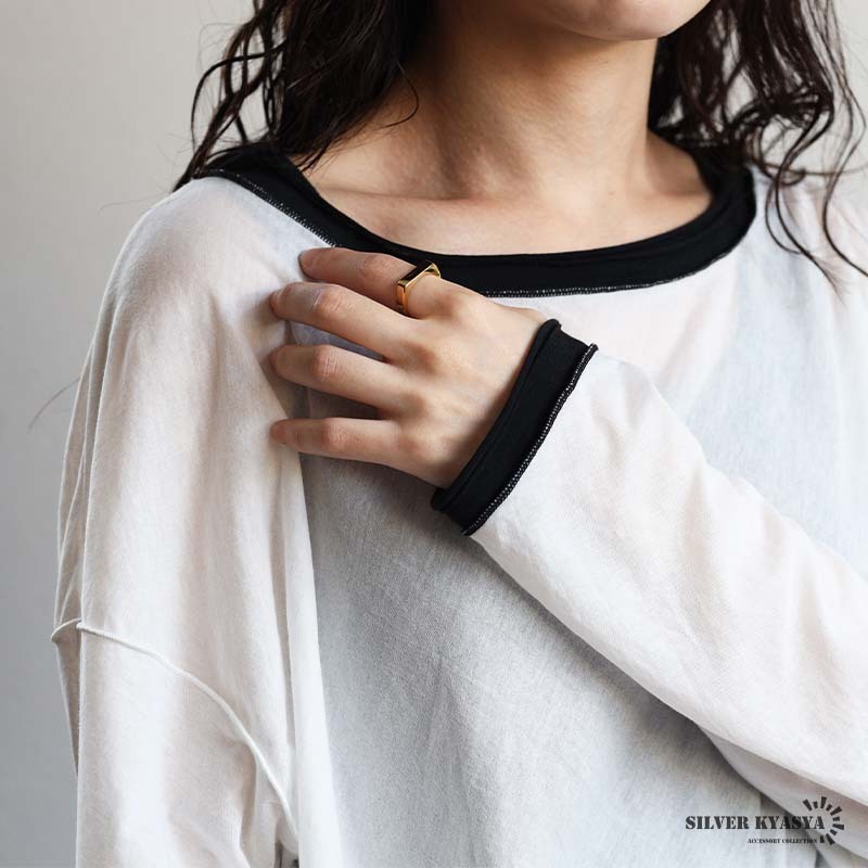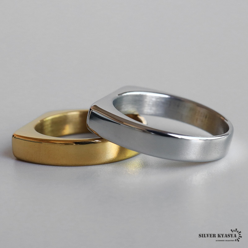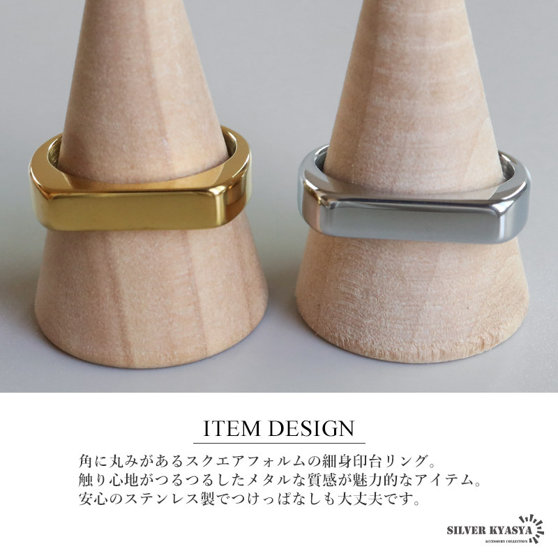 角に丸みがあるスクエアフォルムの細身印台リング。触り心地がつるつるしたメタルな質感が魅力的なアイテム。安心のステンレス製でつけっぱなしも大丈夫です。