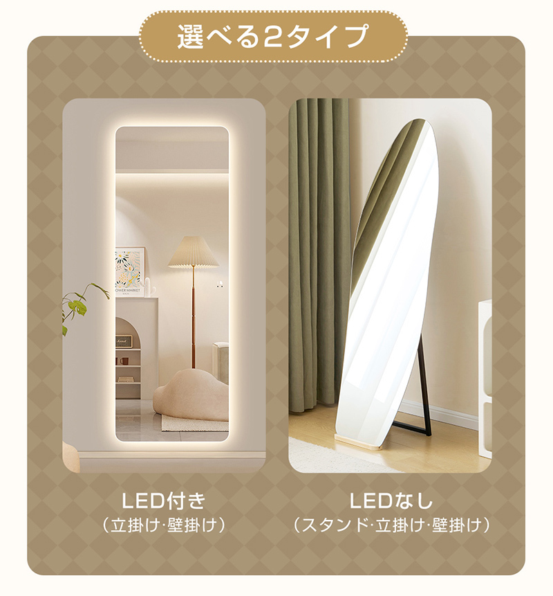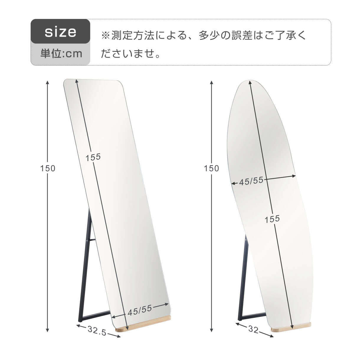 【ウェーブ形LEDなし】【45×155cm】全身鏡 ミラー 玄関 全身 姿見 おしゃれ ウェーブミラー スタンド 壁掛け 立て掛け DIY 自撮り鏡