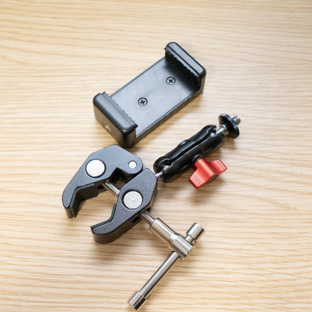 ポール等に挟んで固定できるクランプ、ダブルボール雲台、スマホアダプターのセットです。