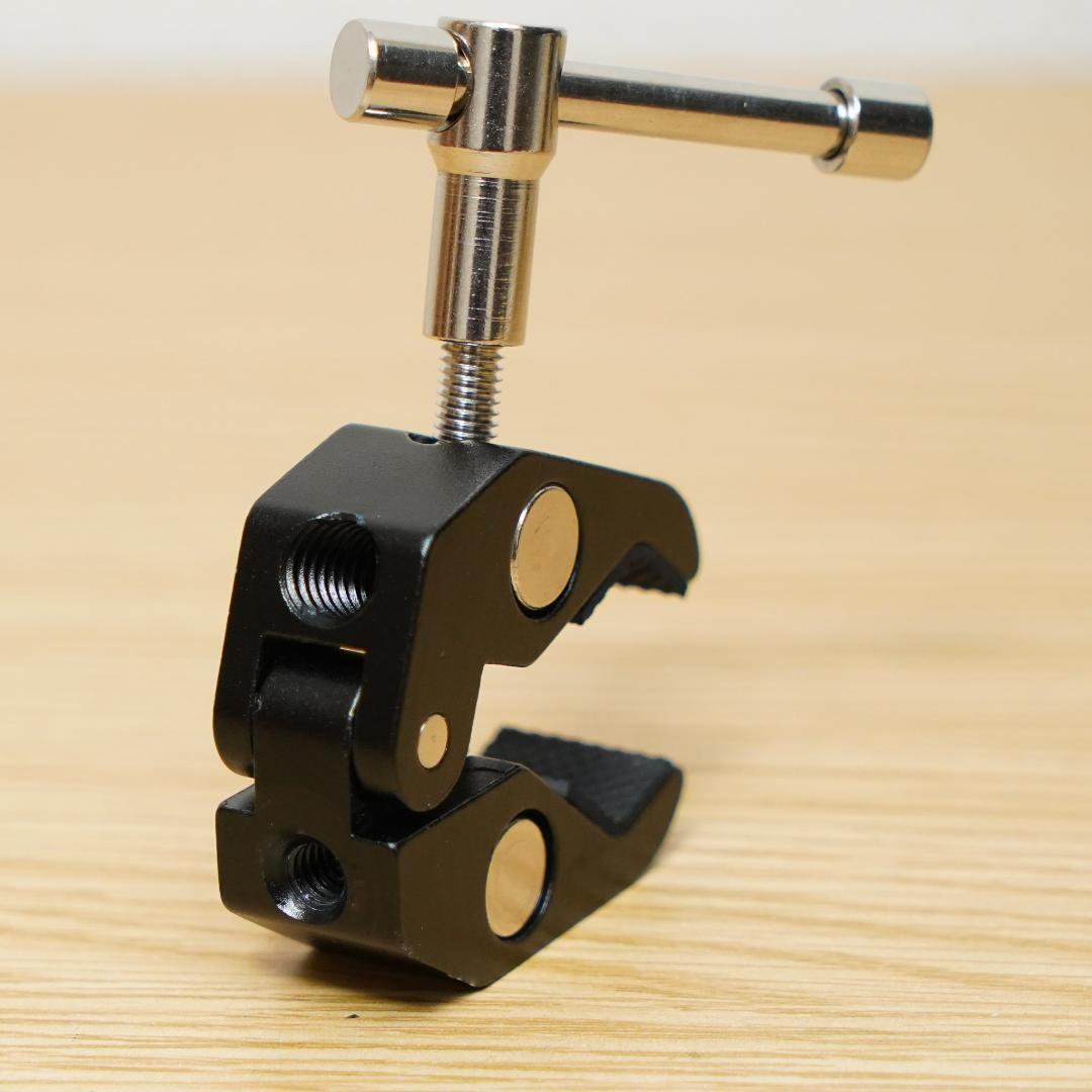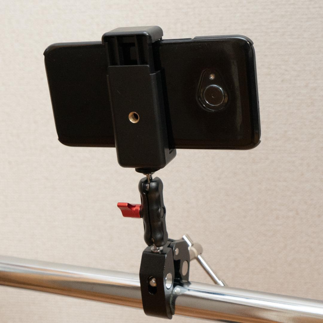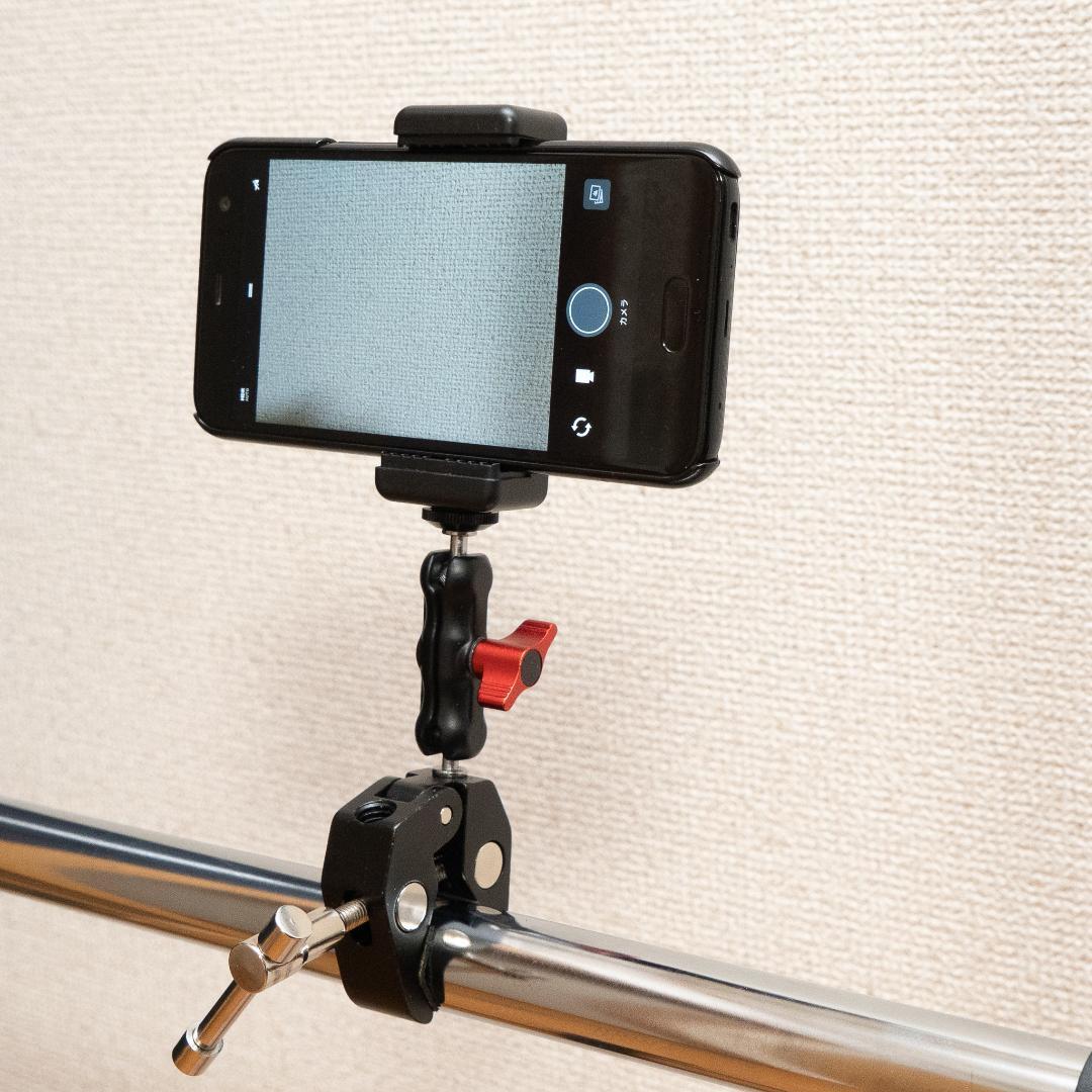 ポール等に挟んで固定できるクランプ、ダブルボール雲台、スマホアダプターのセットです。