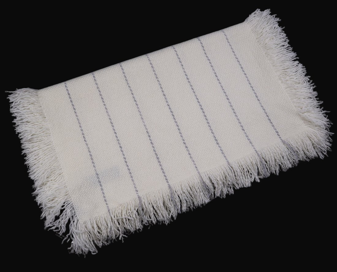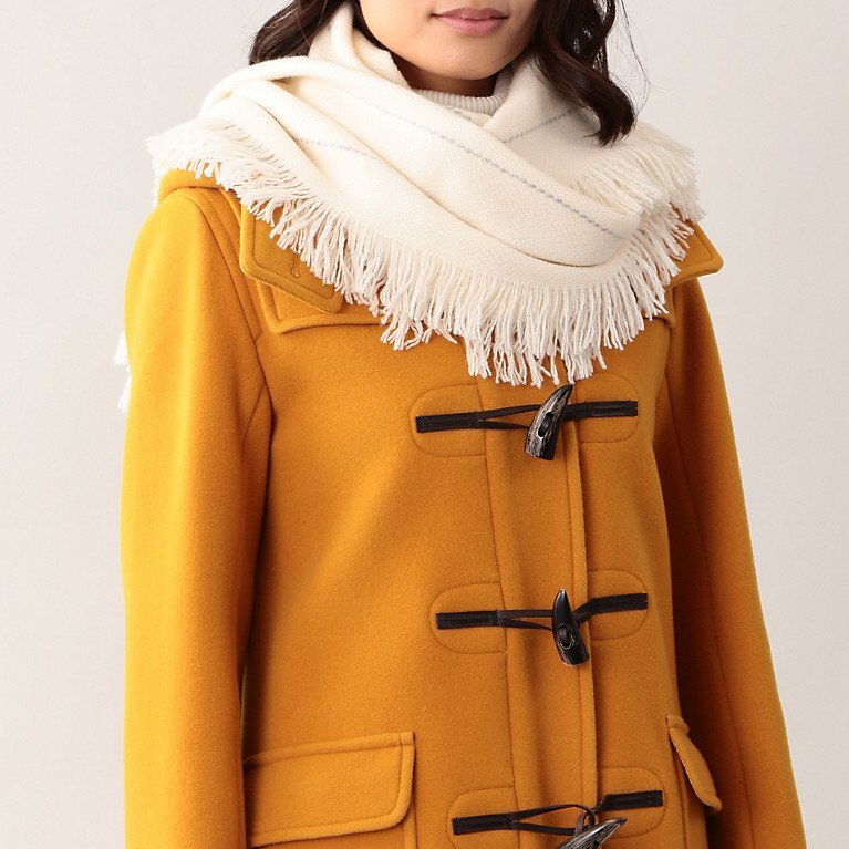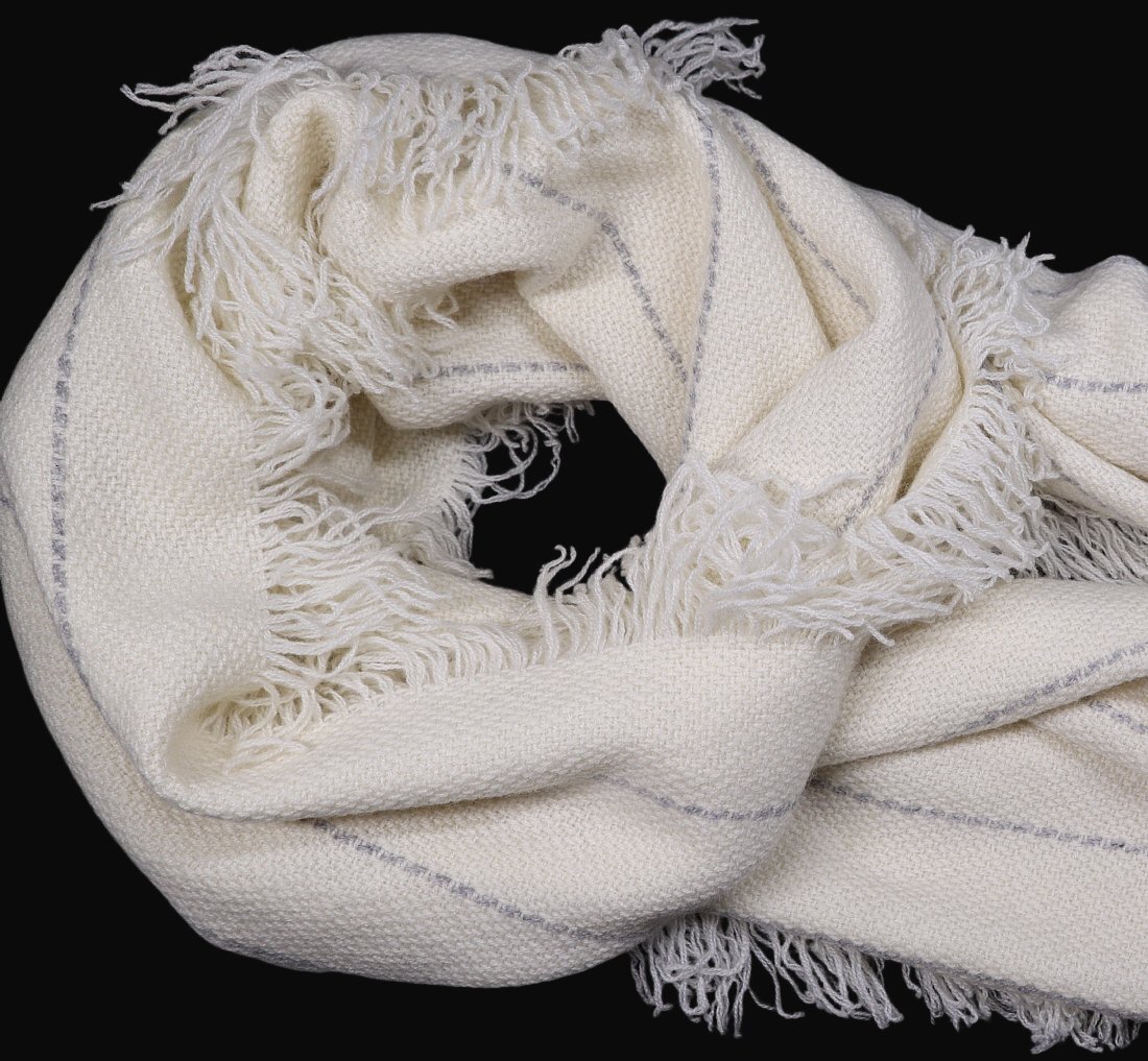 繊維の王様「カシミヤ」を贅沢に100%使用した、オフホワイト色にグレー色のストライプ柄。カシミヤの3本撚りの糸を使用し、ジャガード調に織り上げることで表面に立体感が出て高級感がアップしています。柔らかく暖かく、肌触りが良いです。