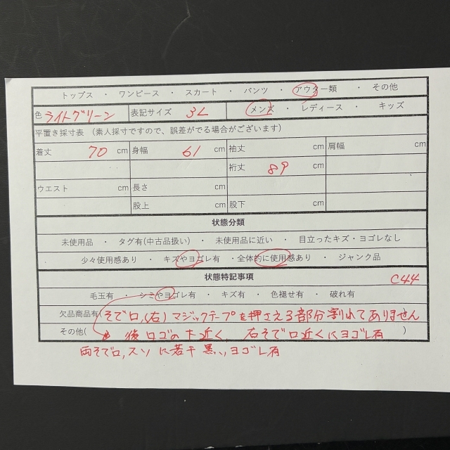 ・欠品商品有(そで口(右)マジックテープを抑える部分剥がれております)