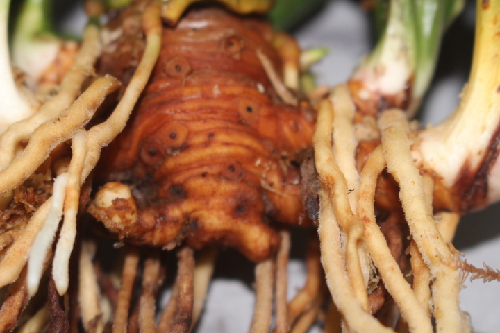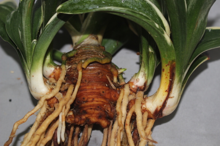 お多福の株立ちです。 5本子付きの6本立ちです。 芽アタリが複数確認できます。  葉キズが数ヶ所あります。   イモは良い状態です。      撮影日  10月 11日     写真をよく見て、ノークレーム・ノーリターンでお願いします。