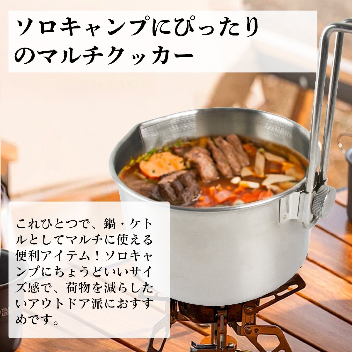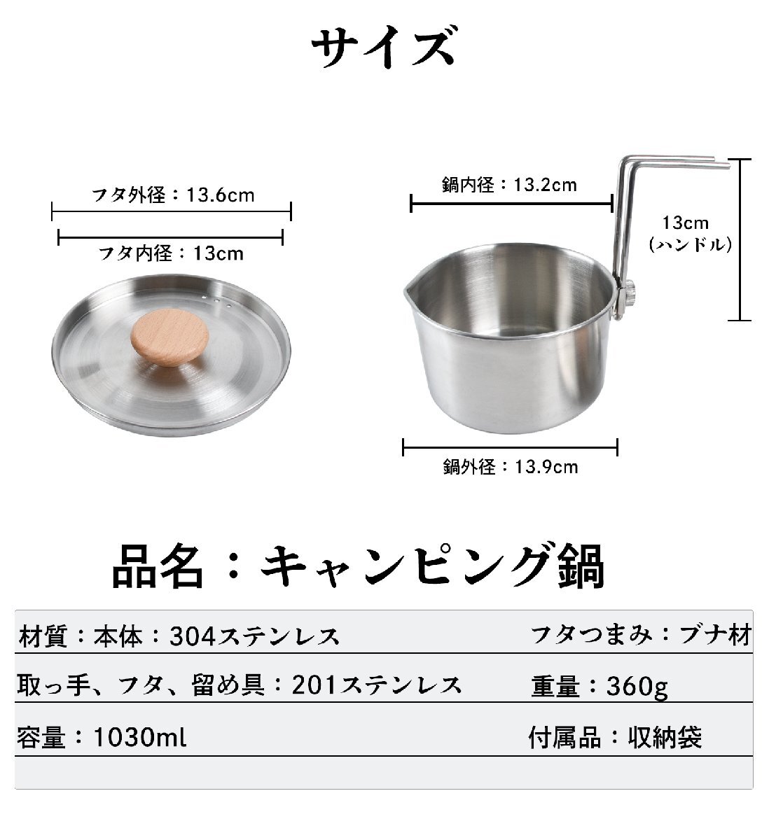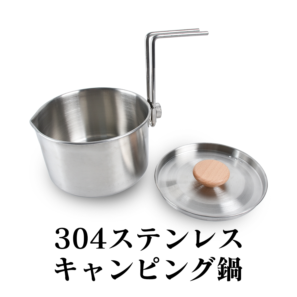 キャンピング鍋 2点セット ソロキャンプ用 クッカー 304ステンレス製 1030ml 軽量360g 天然木ハンドル フタ付き 直火対応