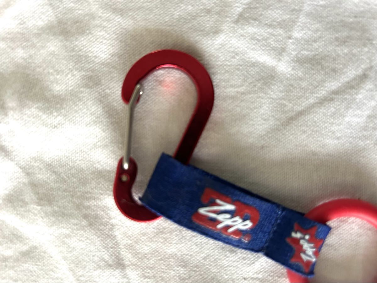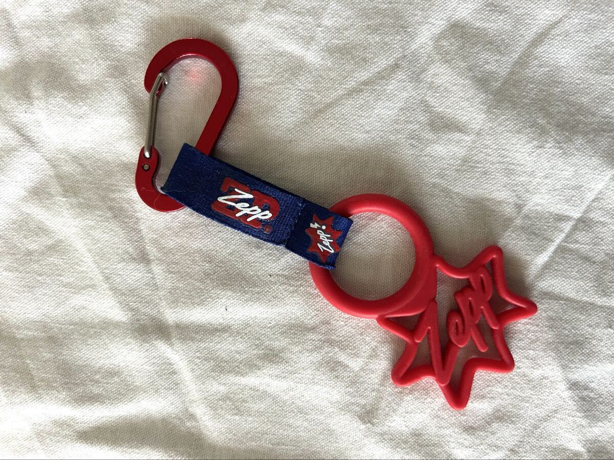 星型のZeppロゴが特徴の赤いペットボトルホルダー キーホルダー、カラビナ付きで便利。