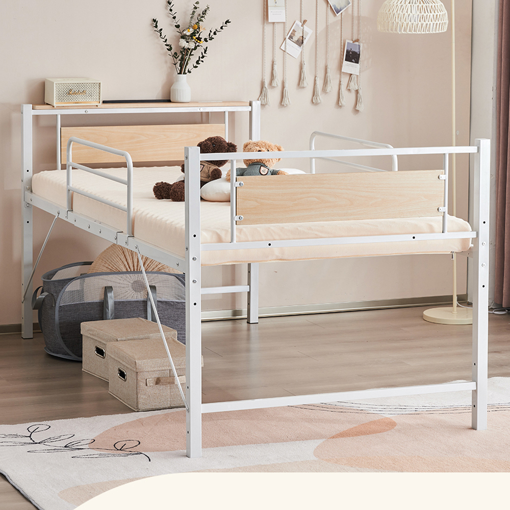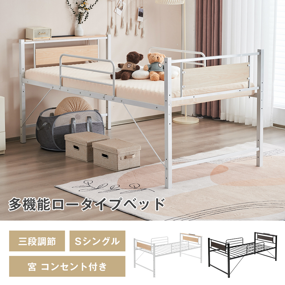 【ホワイト】ロータイプベット 宮棚 ベッド シングル ロング 高さ調節 3段階 パイプ ベット  スチール ベッド下 収納付きフレームベッド
