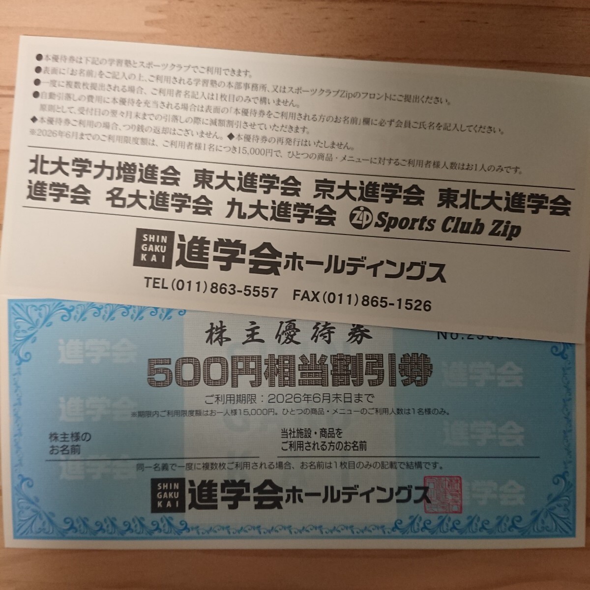 進学会ホールディングス 株主優待券12,000円分(500円券×6枚×4冊)です。