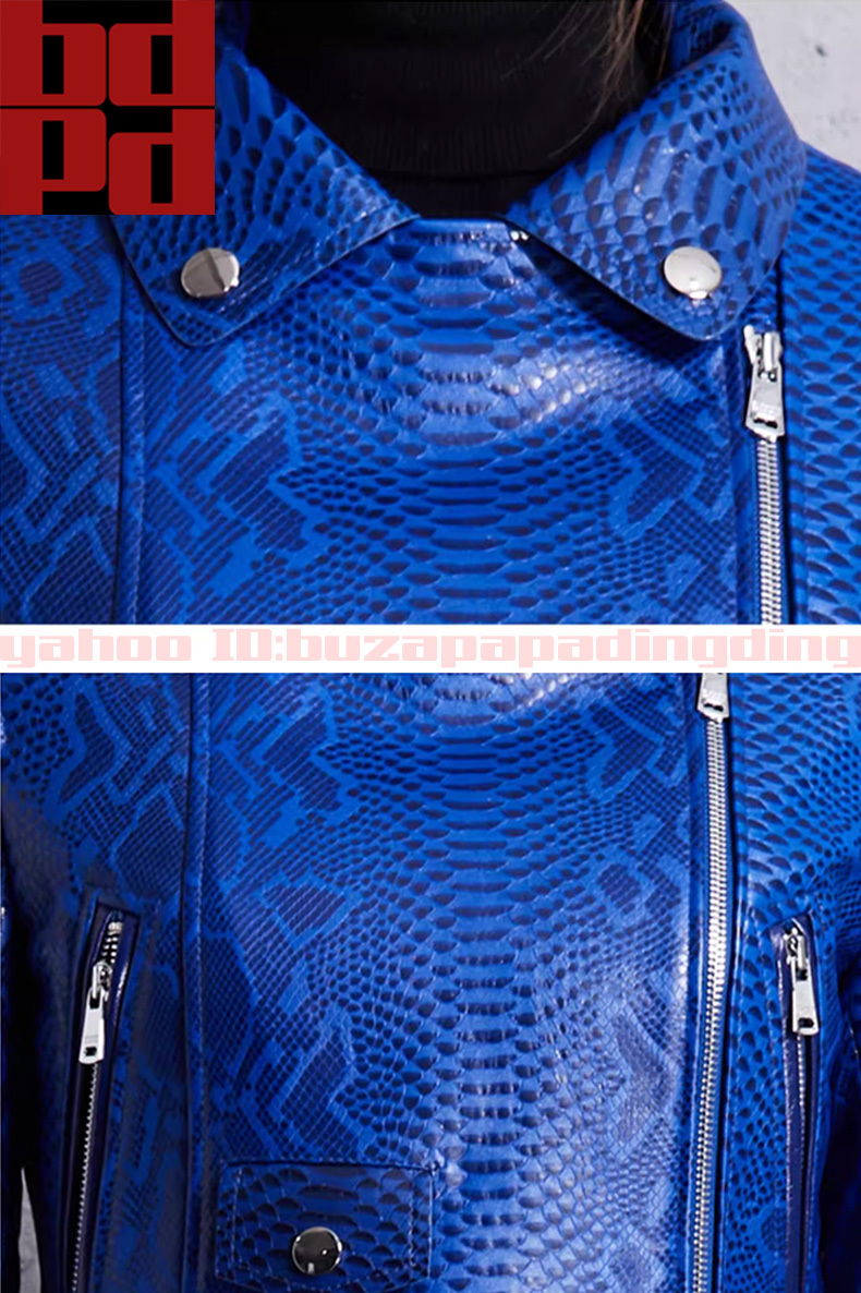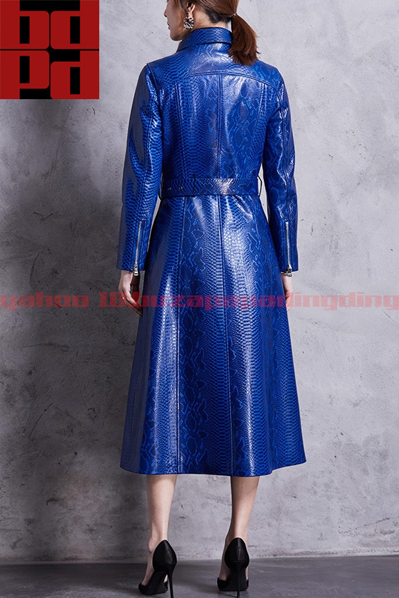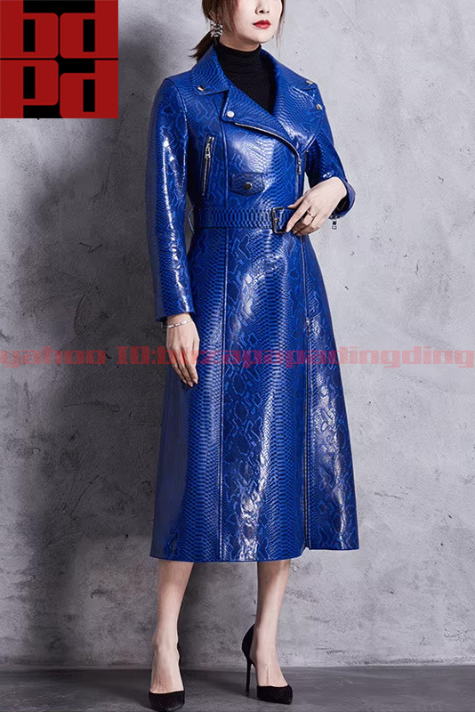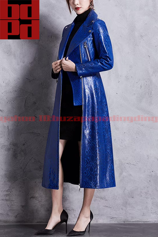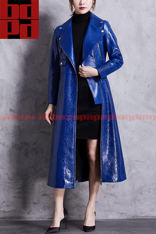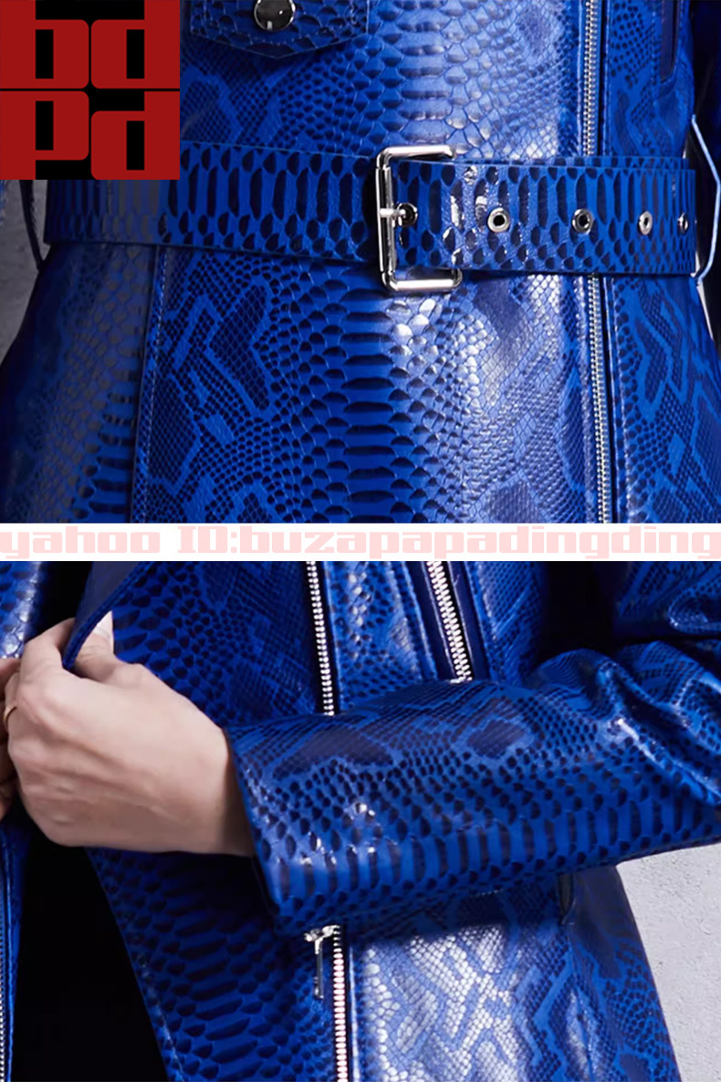 輸入ラムレザーにピザード(ヘビ)プリントを施した、アシンメトリーなデザインのトレンチコート。斜めジップとワイルドな柄が特徴的で、機能性と強い個性を兼ね備えた一品です。