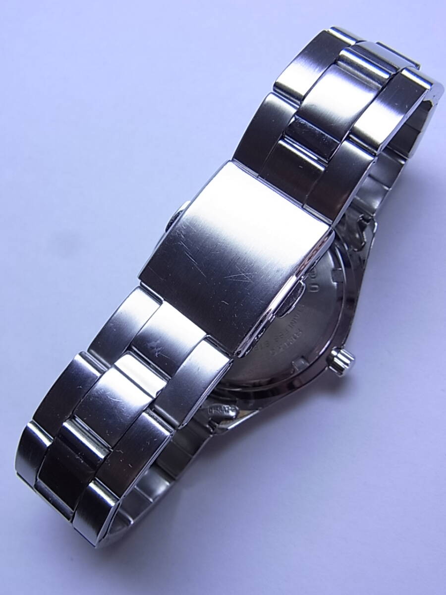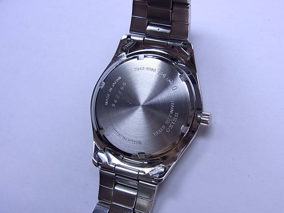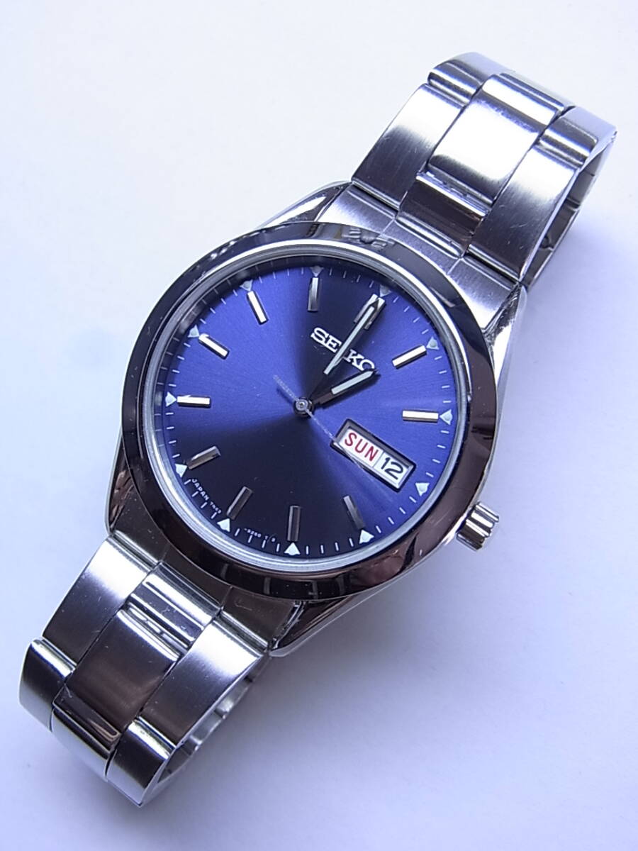 SEIKOセイコーのメンズクォーツウォッチです。文字盤カラーはネイビー系。ガラス面は目視チェックにおいて特に目立つようなキズはありません。ケースやブレスに多少のスレはありますが、全体的には良いコンディションだと思います。簡易クリーニング済。ケース横幅約37mm、腕周り現状約19.0cmでこれ以上大きくすることはできません。現在、電池も入っており快調に動いていますが、電池寿命は不明。中古品ですのでご不明な点はご質問頂き、十分ご納得のうえでご入札ください。安値スタートですので落札後の返品、クレームはご容赦願います。発送はゆうパック、レターパックプラス。なお、評価に「悪い」が多い方や新規の方の落札者に不払いが多いため、「悪い」評価が全体の3%以上ある方は入札しても削除させて頂きます。また新規の方、評価の少ない方もこちらの判断で削除させて頂くことがあります。
