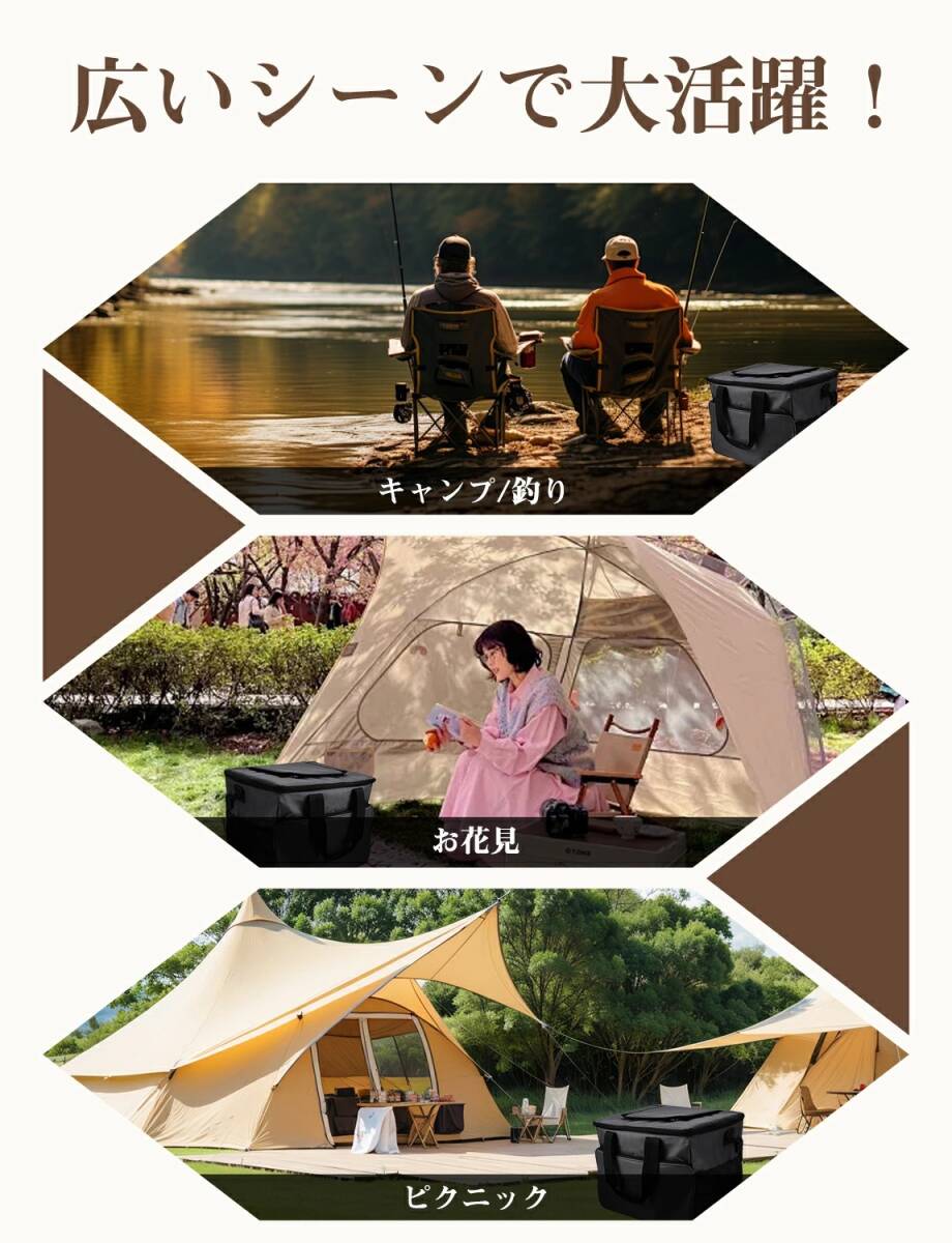 【多用途で便利】キャンプや釣り、BBQ、花火、ピクニック、運動会、お花見など、さまざまなシーンで活躍します。35Lという大容量を誇り、グループでの使用に最適です。例えば、BBQでは食材や飲み物を収納しておけば、長時間冷たく保つことができるので、途中で冷たい飲み物が足りなくなる心配がありません。また、ピクニックや運動会では、大人数の食べ物や飲み物をまとめて持ち運ぶことができ、使い勝手が非常に良いです。
