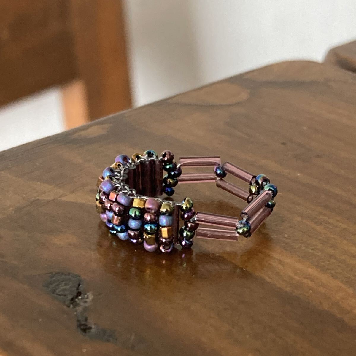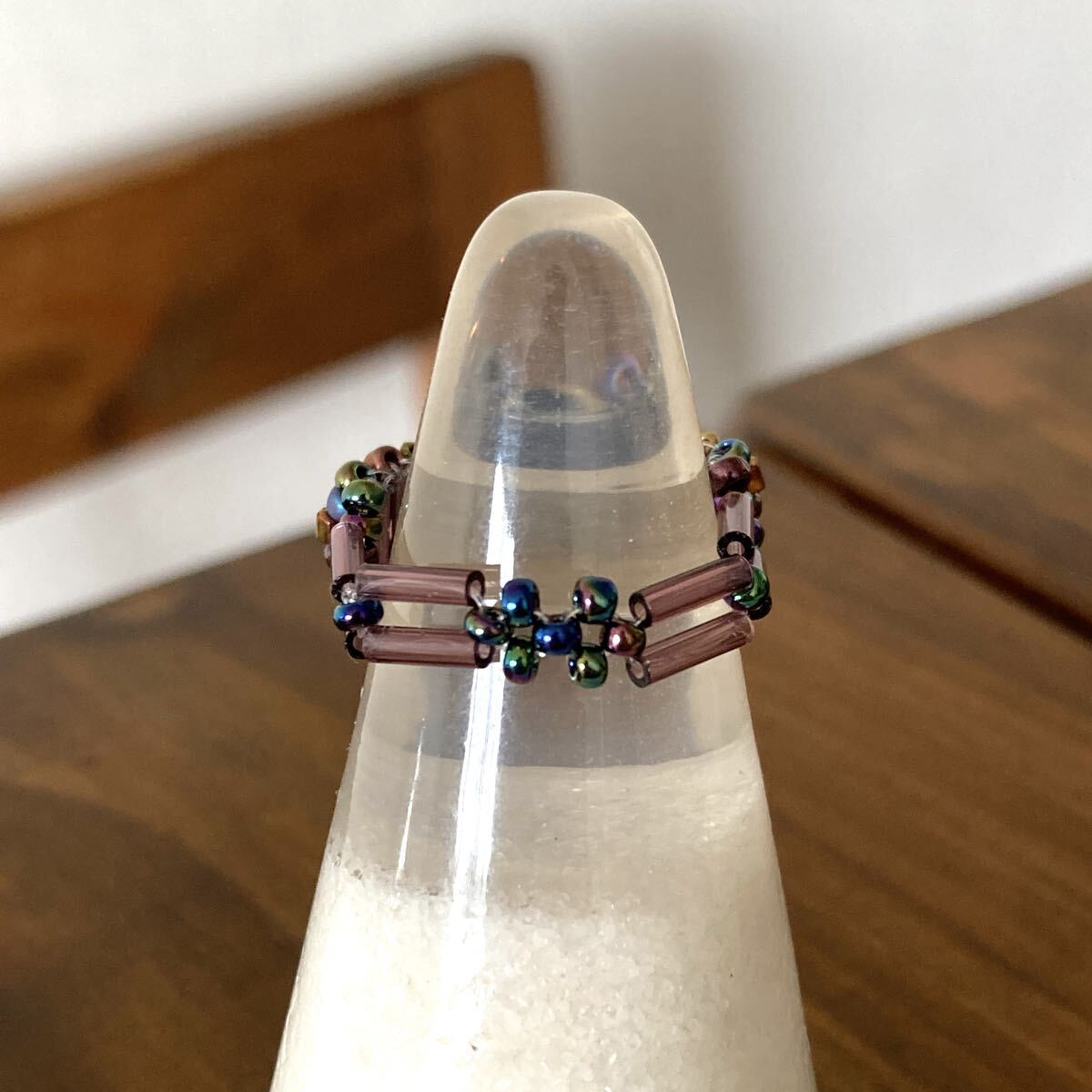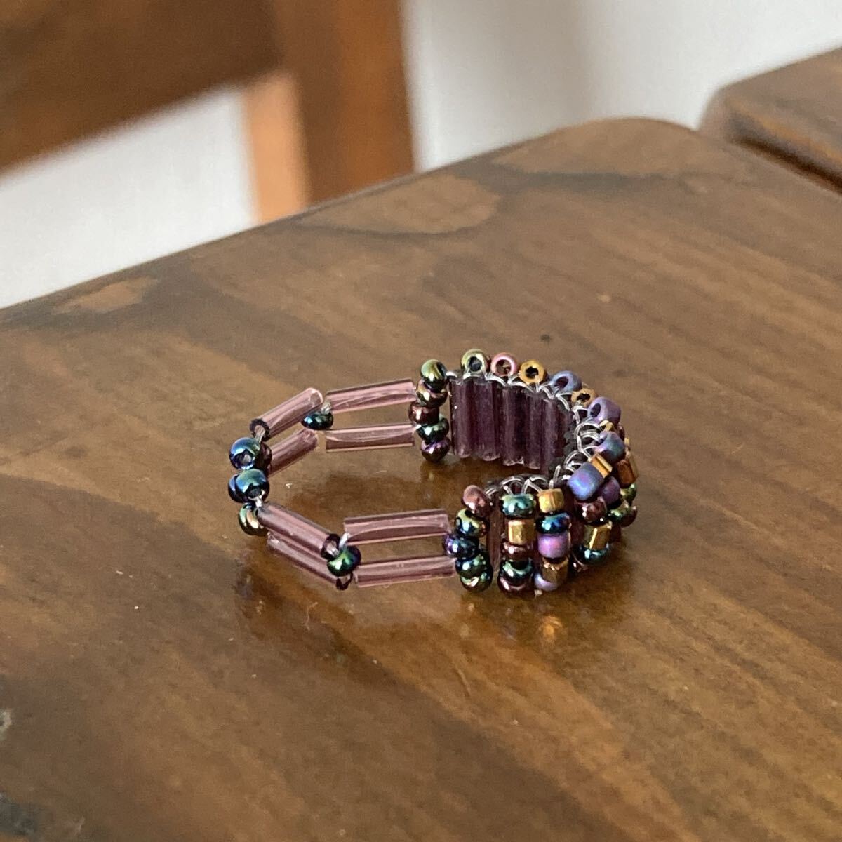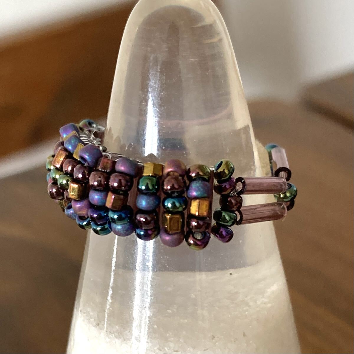 パープル、ブロンズ、玉虫系等の丸小ビーズ、6mmのクリアパープルの竹ビーズで作ったリングです。