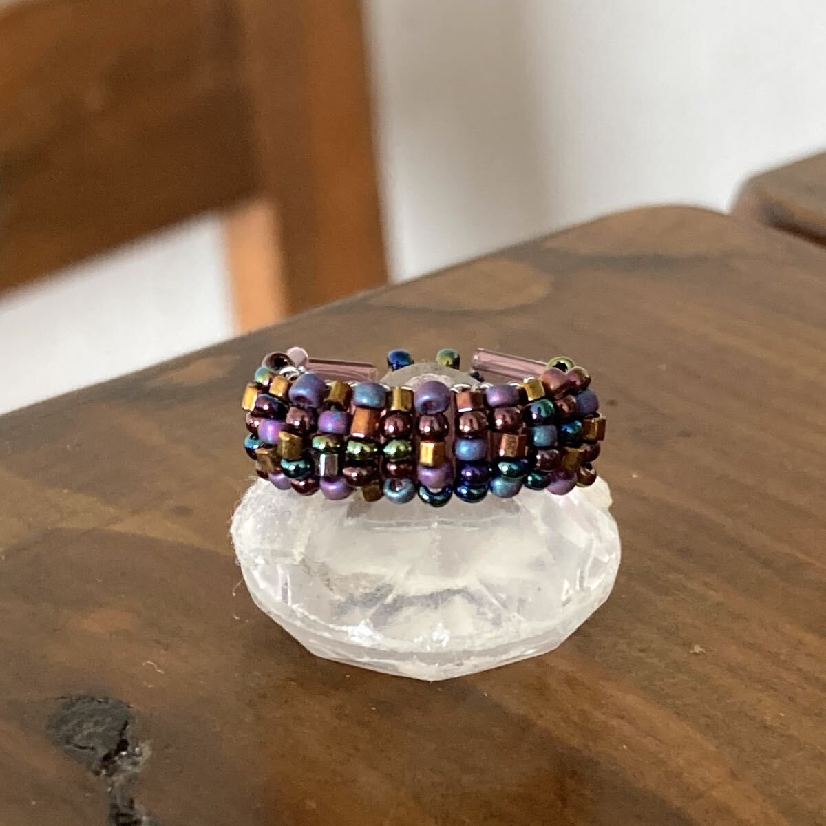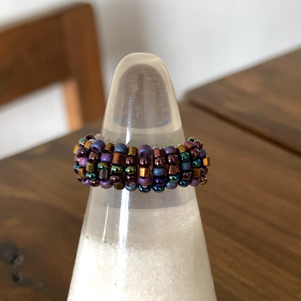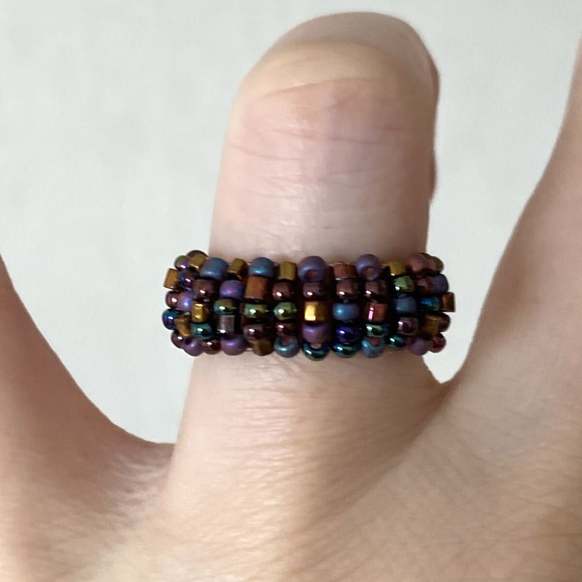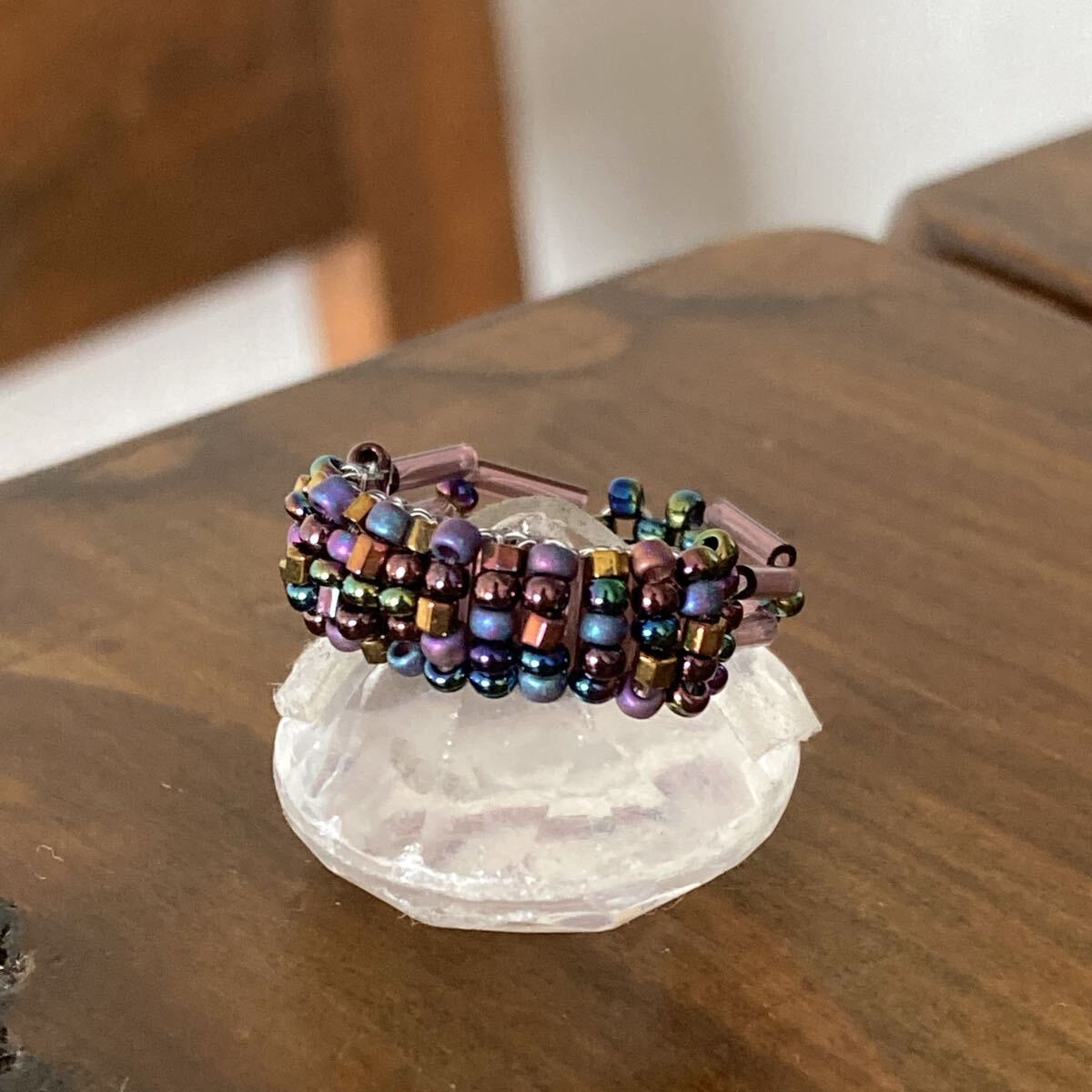 パープル、ブロンズ、玉虫系等の丸小ビーズ、6mmのクリアパープルの竹ビーズで作ったリングです。