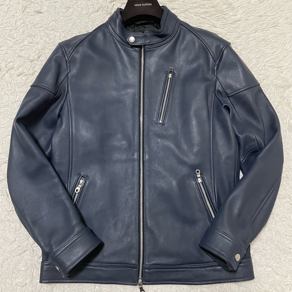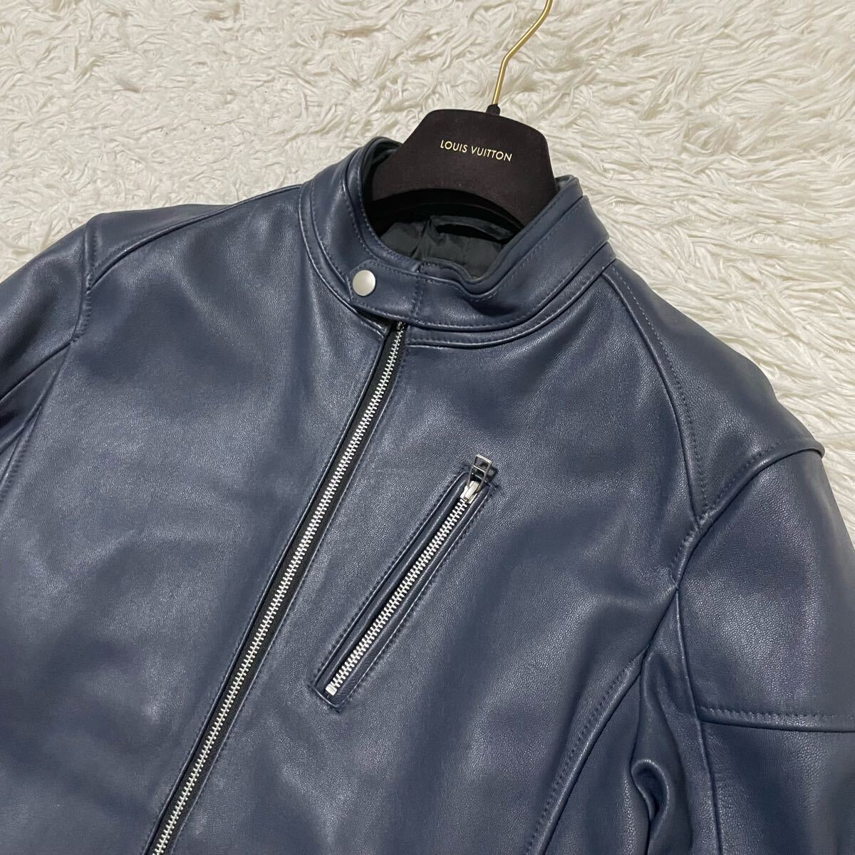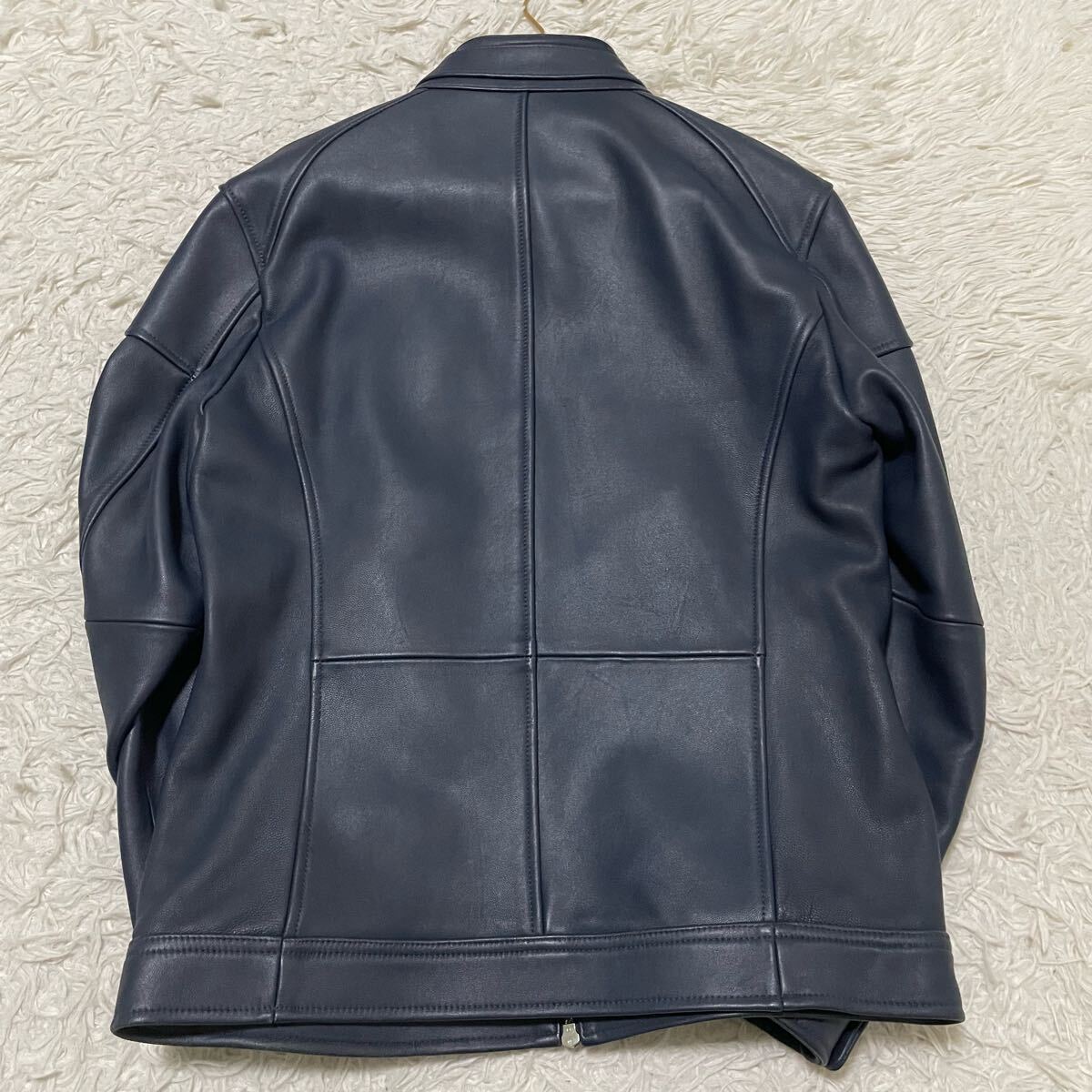 希少LLサイズ メンズビギ【極美品/人気カラー】ラムレザージャケット ライダースブルゾン ネイビー系 本革 羊革 MEN'S BIGI ツヤ感 色気