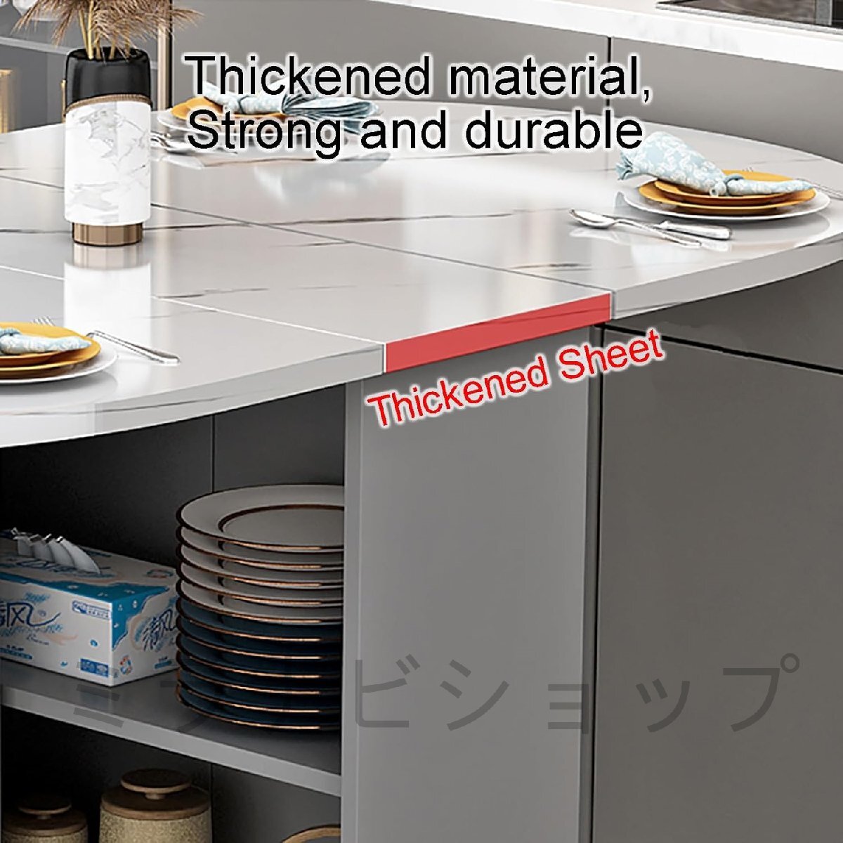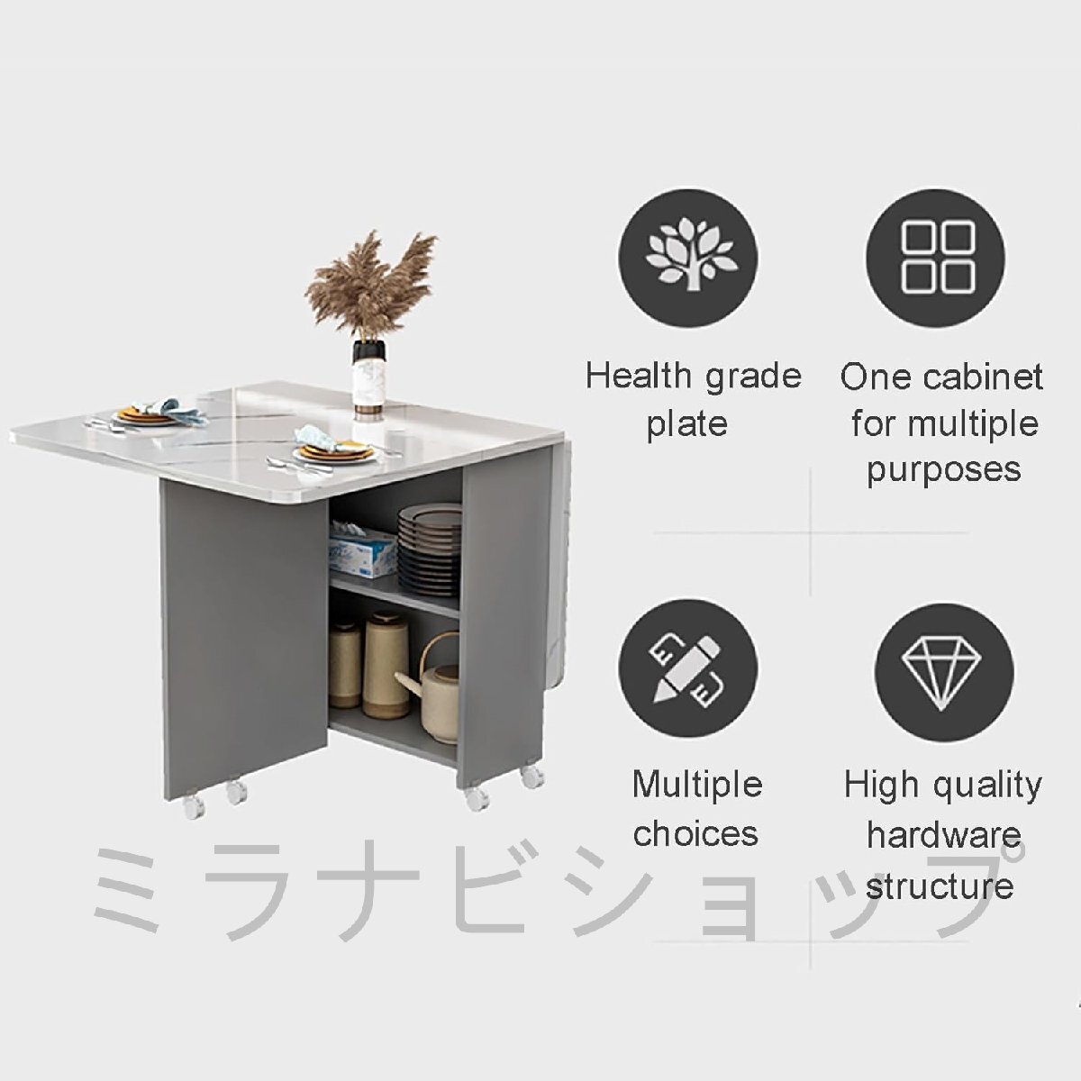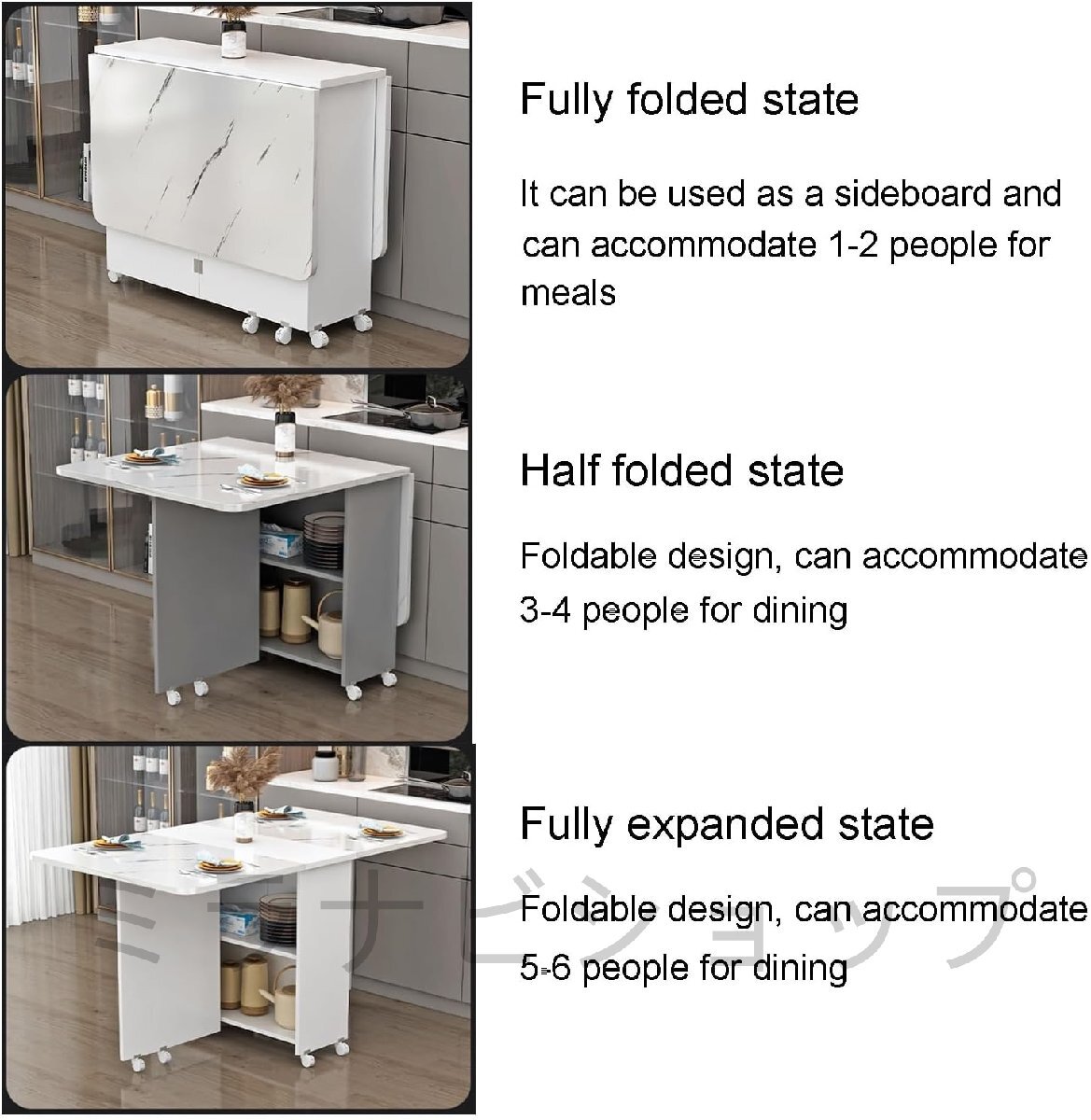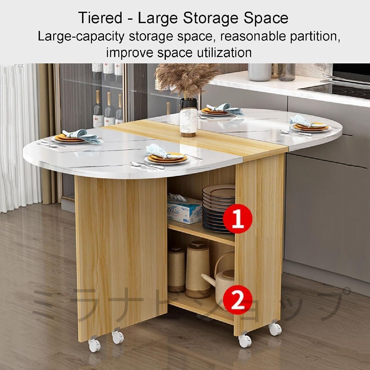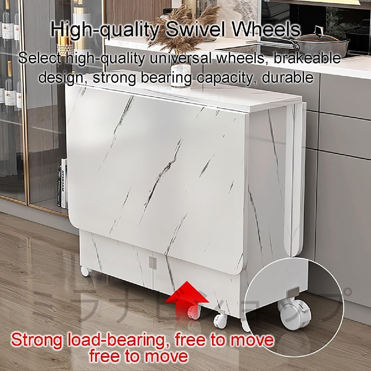 6つの車輪と収納棚を備えた折りたたみ式ダイニングテーブル。省スペースの折りたたみ式デザイン。ディナー用の伸長式キッチンオフィスデスクテーブル。多目的に使える折りたたみ式ドロップリーフ家具。カラーオプション。