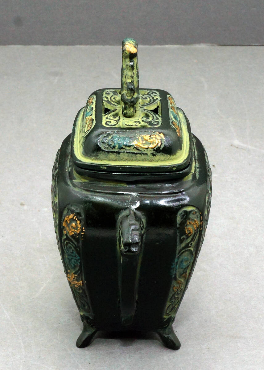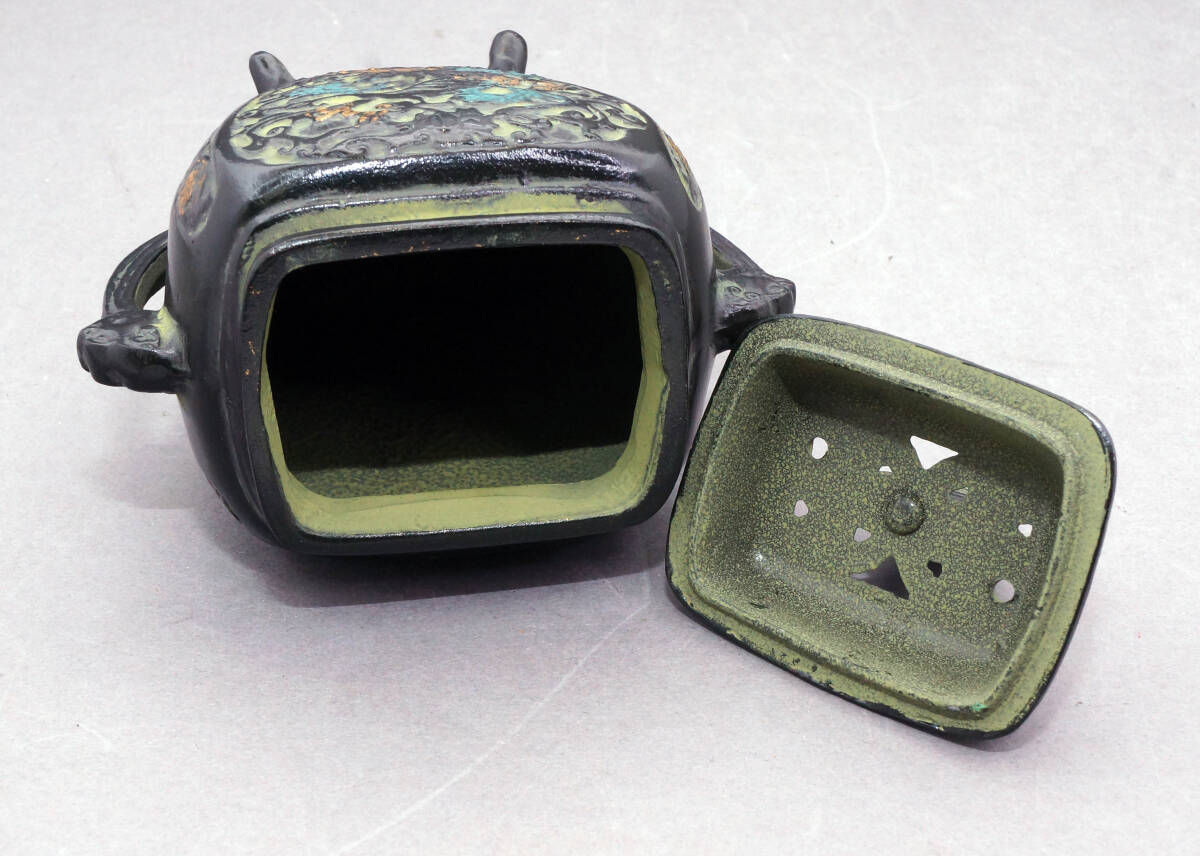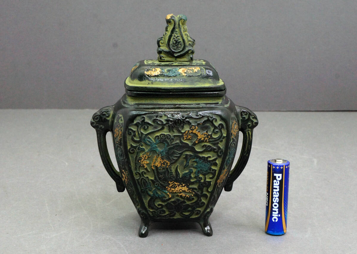 | 商品説明 | 四足香炉 銘無し 金属製 サイズ:W105㎜×D65㎜×H140㎜ 未使用品ですが経年保管による傷・汚れ等のダメージが御座います。 |