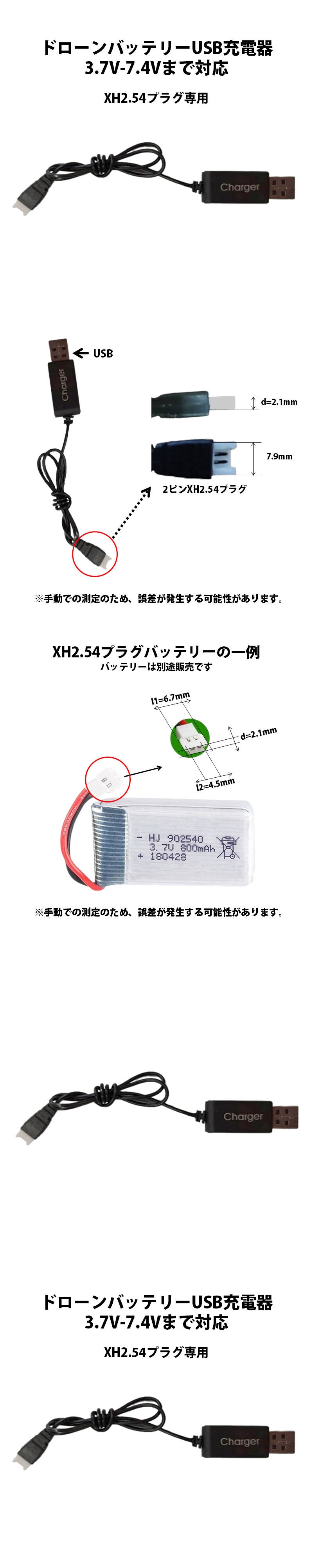 | USB充電ケーブル入力電圧:3.7V-7.4V,LEDランプ付きXH2.54プラグについては、商品の詳細図をご参考ください。 |
