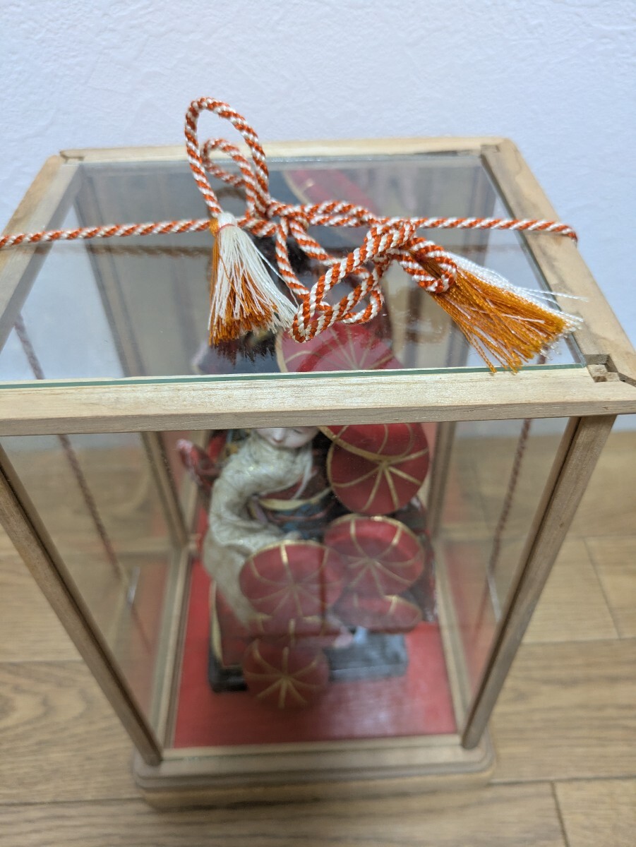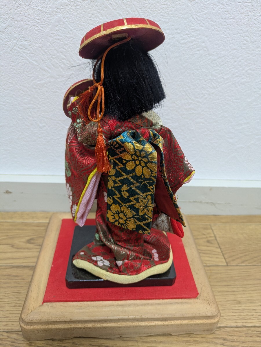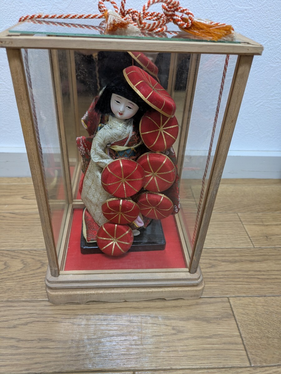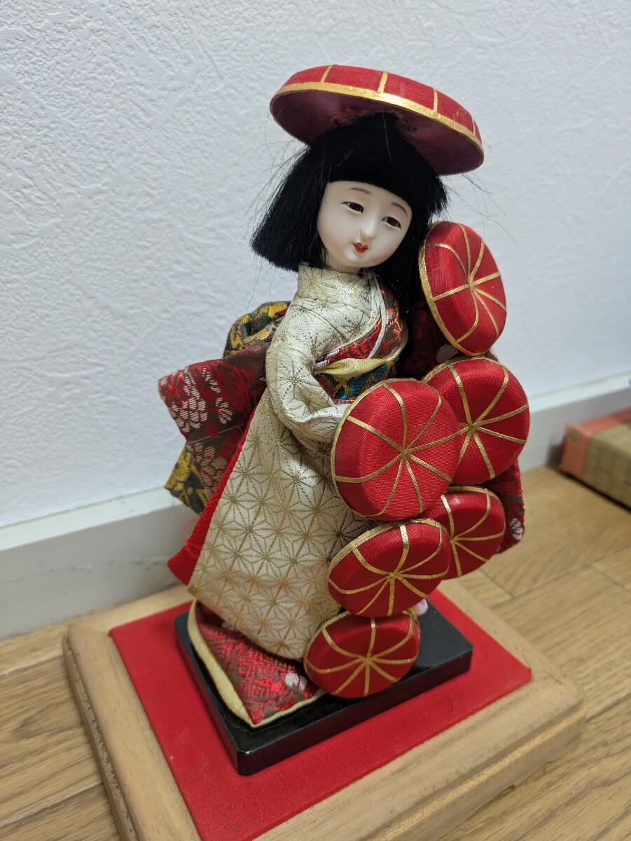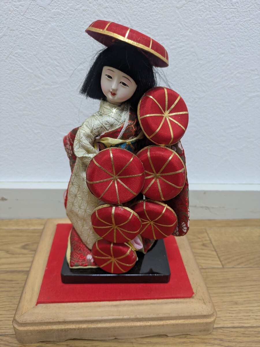 伝統的な市松人形、赤い傘の装飾が特徴的。