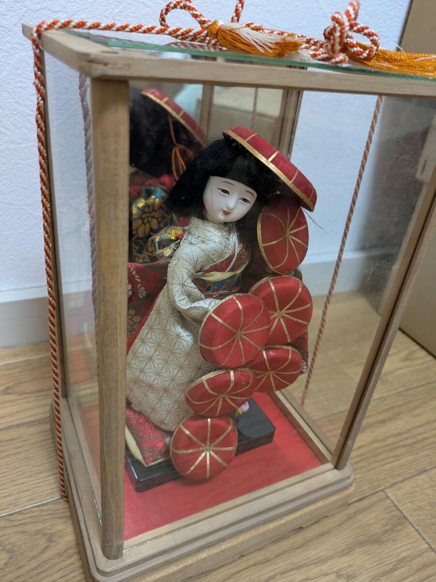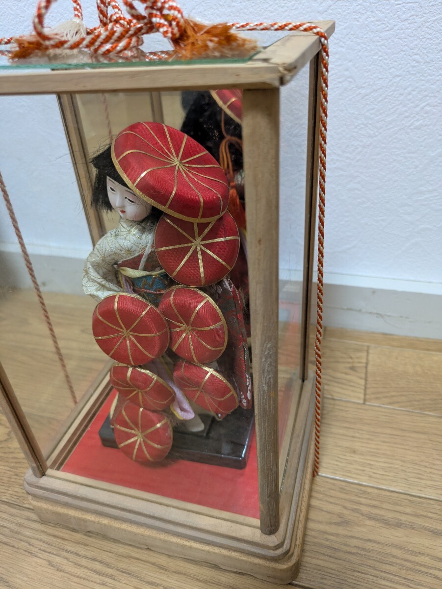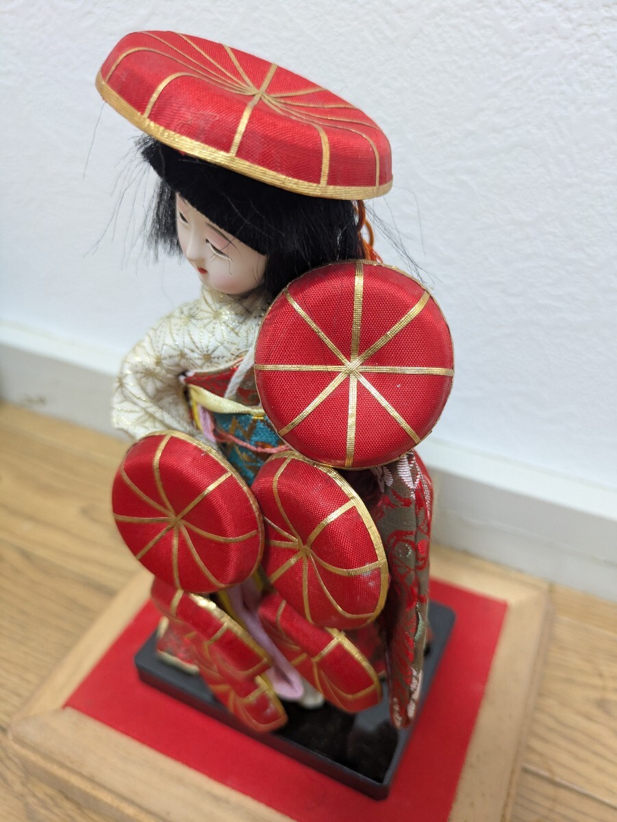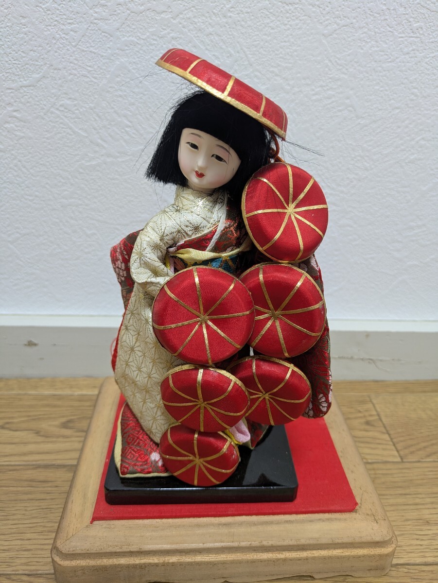 伝統的な市松人形、赤い傘の装飾が特徴的。