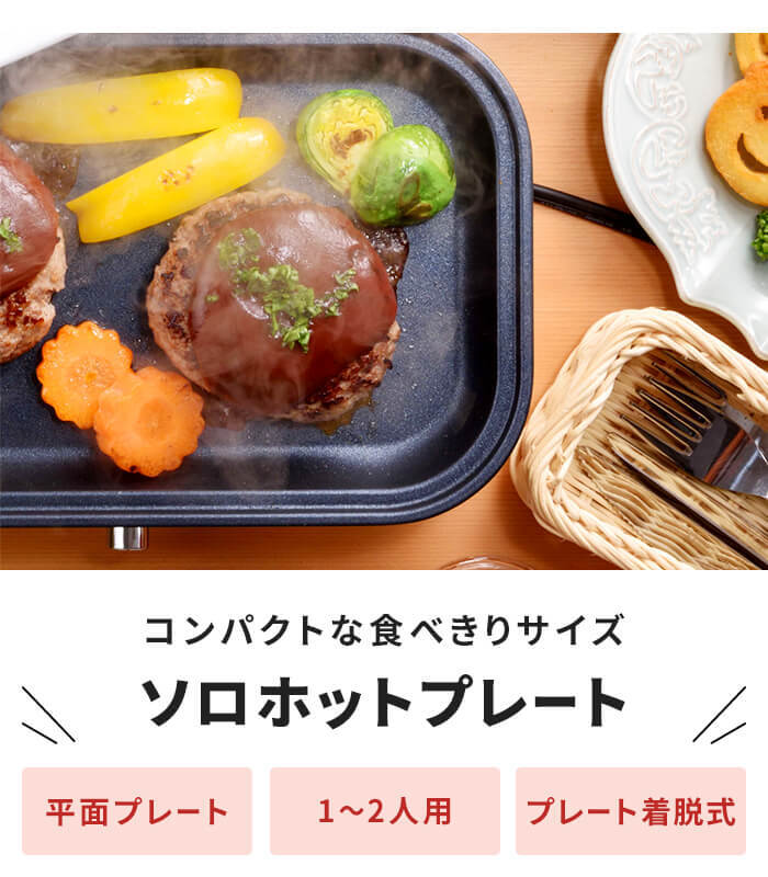 | ・1~2人用にちょうどいい大きさのホットプレート。 ・温度調節機能付きで調理から保温まで可能。 ・およそA4サイズでテーブルの場所を取らずに調理ができます。 ・フッ素樹脂塗装でお手入れ簡単。 ・プレートは着脱式で丸洗いできます。 |