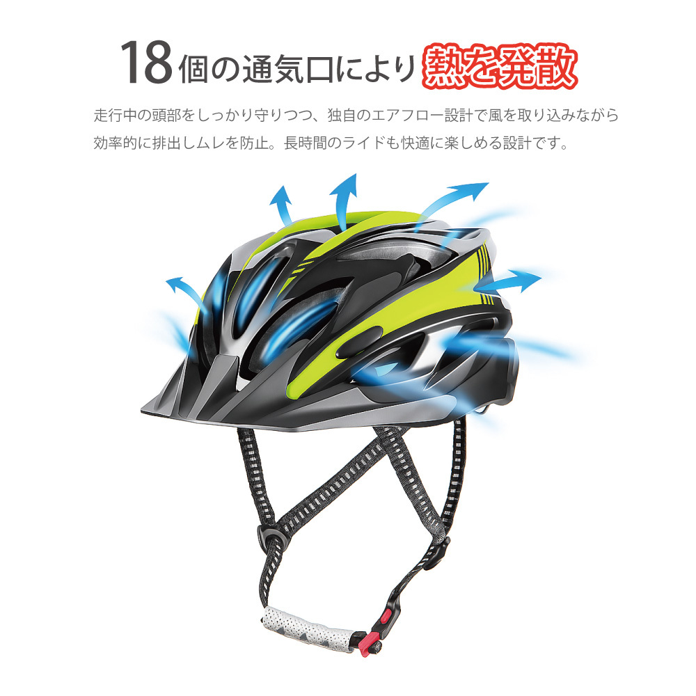 独自のエアフロー構造により、18個の通気口から効率よく風を取り込み、頭部のムレを防止。