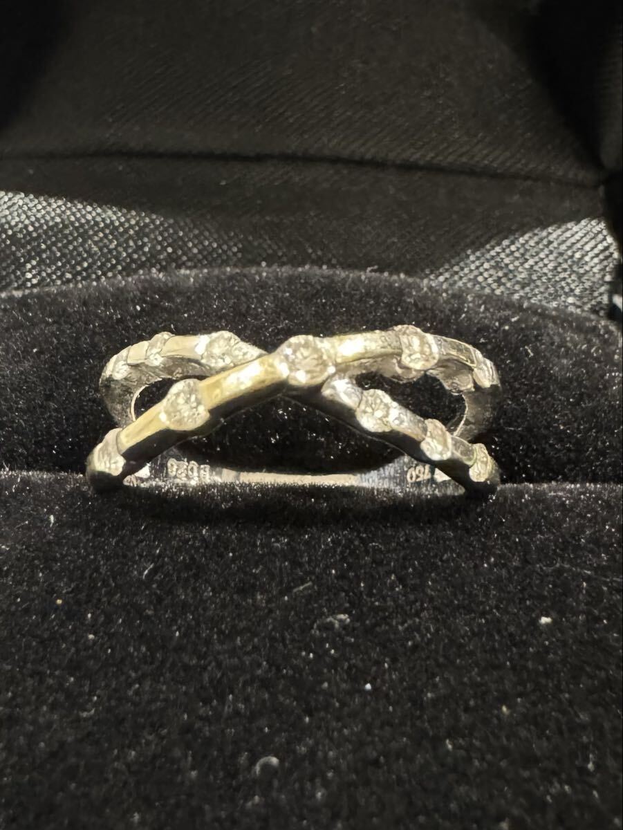 繊細に絡み合うクロスモチーフが印象的な、K18ホワイトゴールド製の上品なリングです。