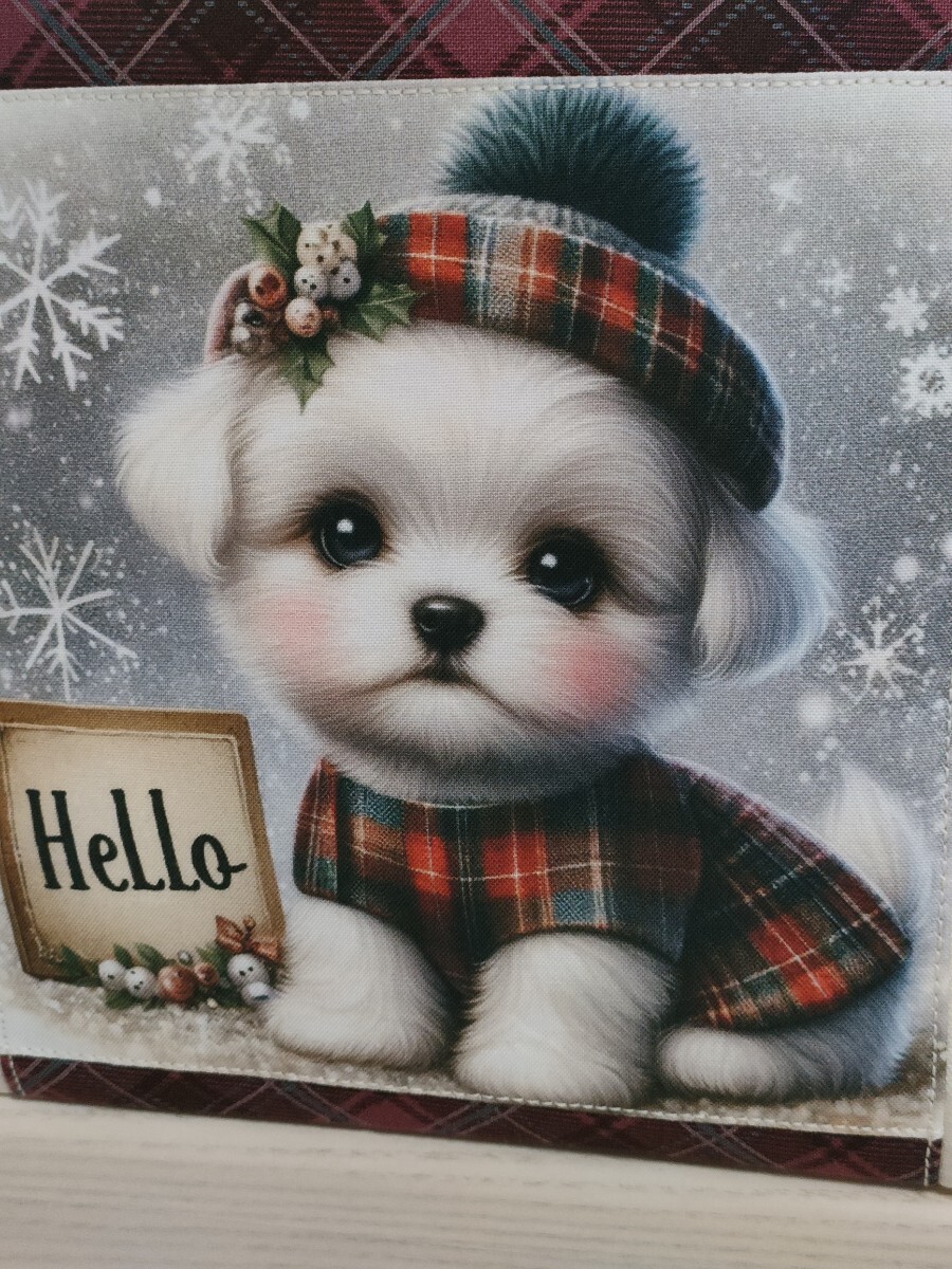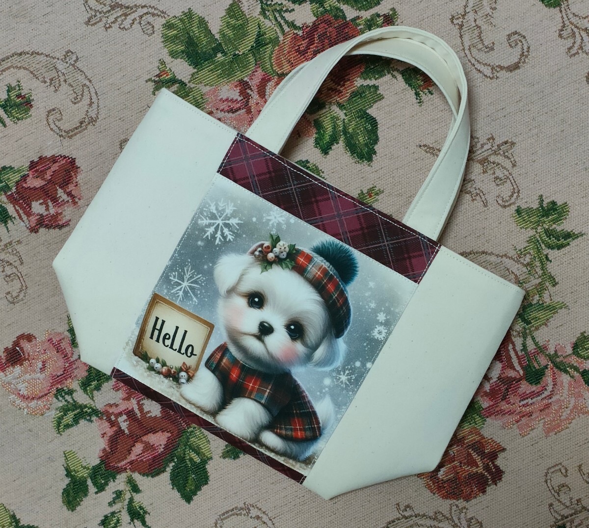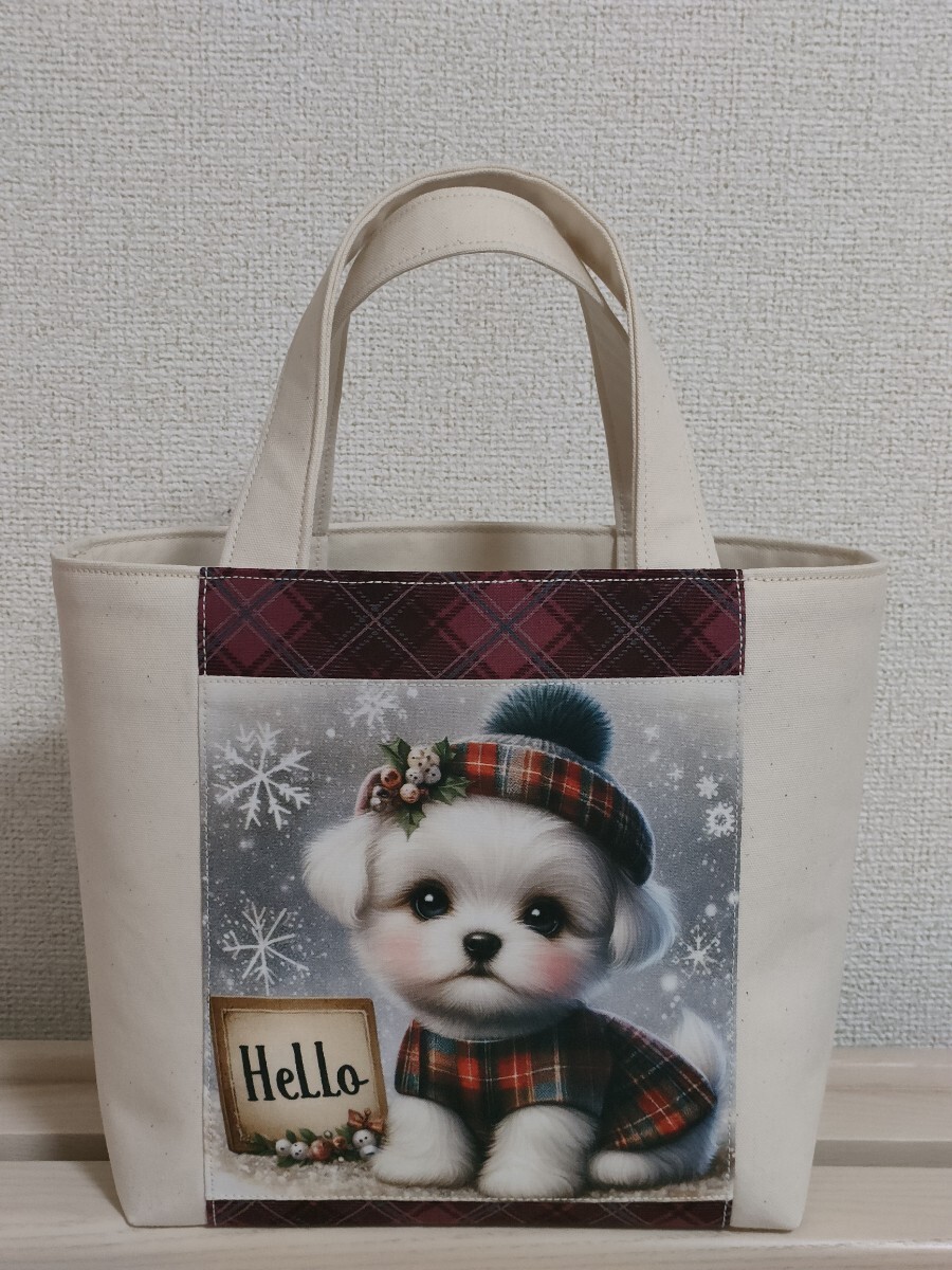 タータンチェック柄のお洋服を着飾った、ハットをかぶった可愛いマルチーズのミニトートバッグはいかがでしょうか♪