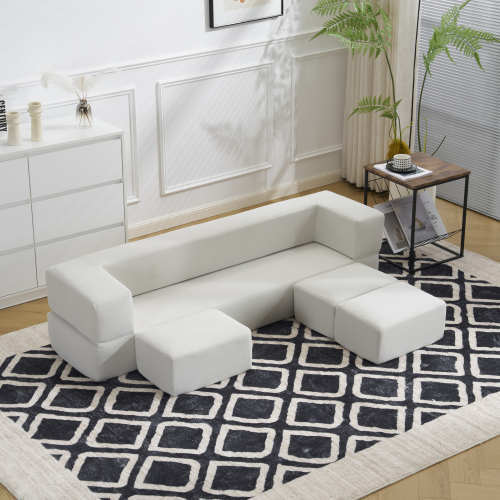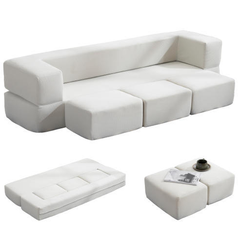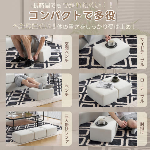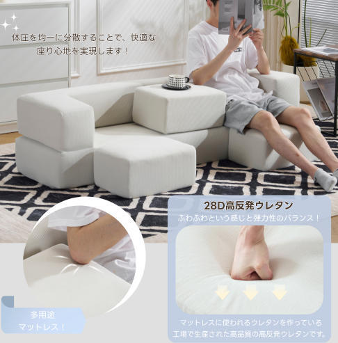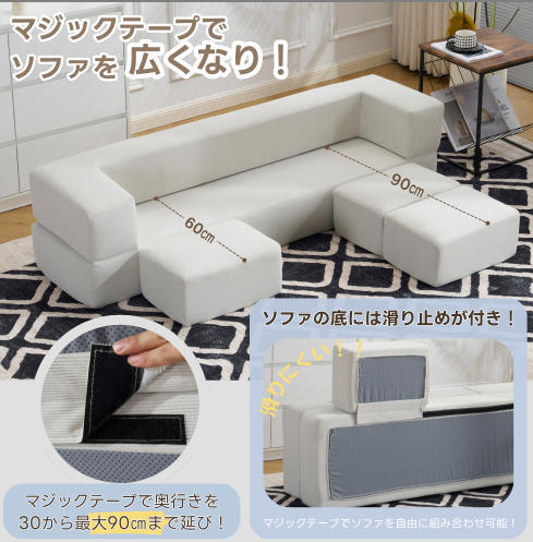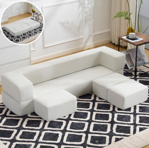 • 【多機能構成】このソファは、折りたたみ式のソファ1台と、小型スツール3台で構成されています。合計5人まで快適に座れる設計で、スツールはミニテーブルやサイドテーブルとしても活躍します。