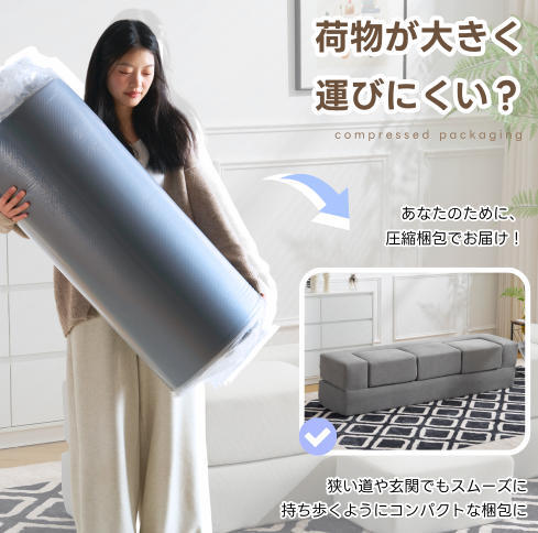 • 【圧縮梱包で便利だ】このソファは、圧縮梱包されてコンパクトにお届けするので、狭い道や玄関でもスムーズに持ち歩けます。そして、ソファとクッションの純量は11kgぐらいで、女性一人でも楽に搬入・移動できます。ソファは完成品なので、組立て不要で、時間も節約します。