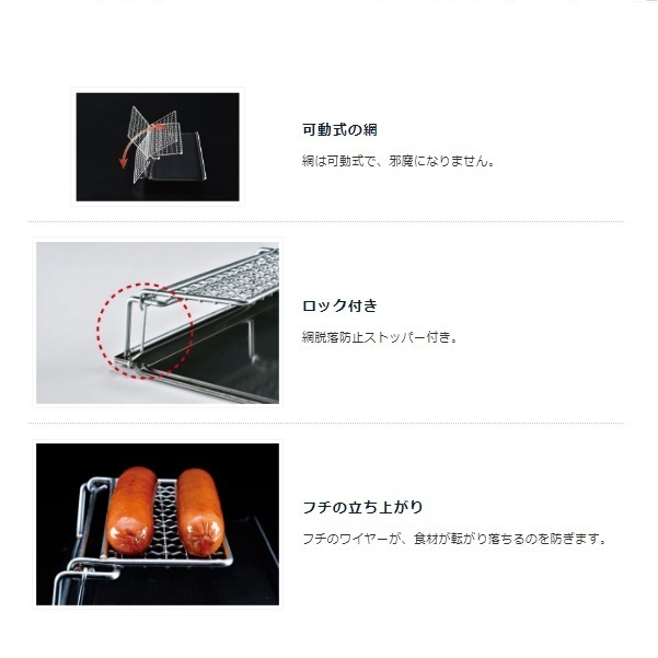 網のフチのワイヤーが、食材が転がり落ちるのを防ぎます。
