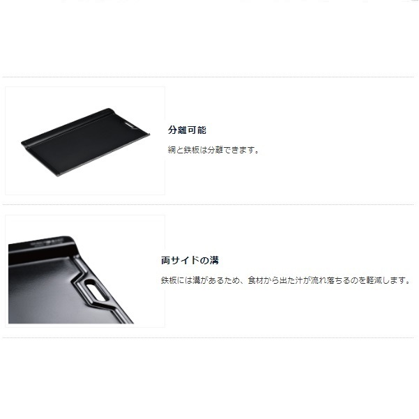 鉄板の周囲には溝があるため、食材から出た汁が流れ落ちるのを軽減します。