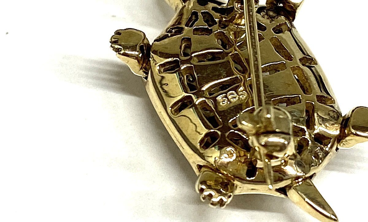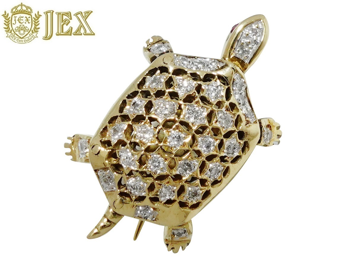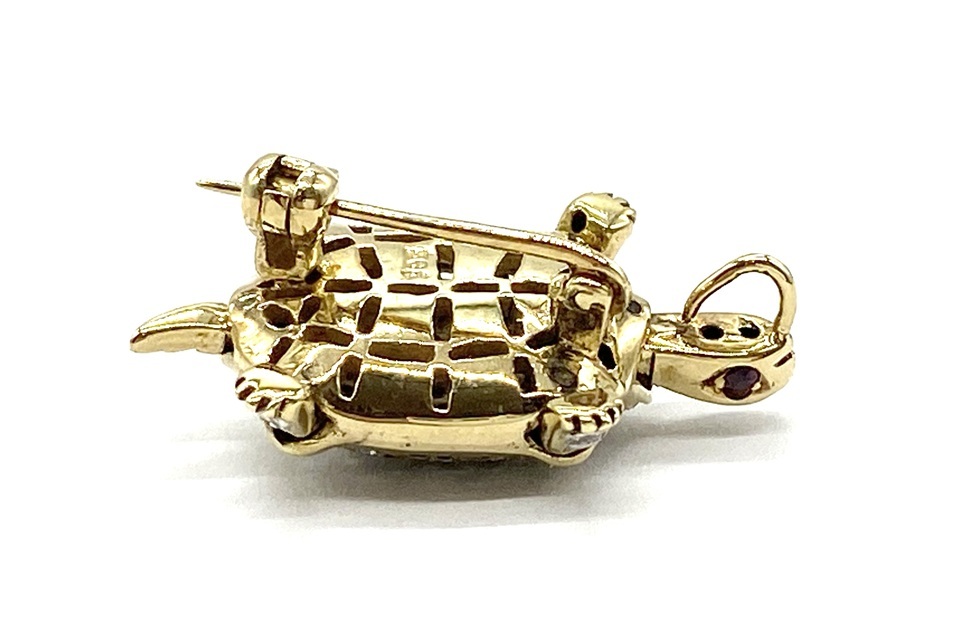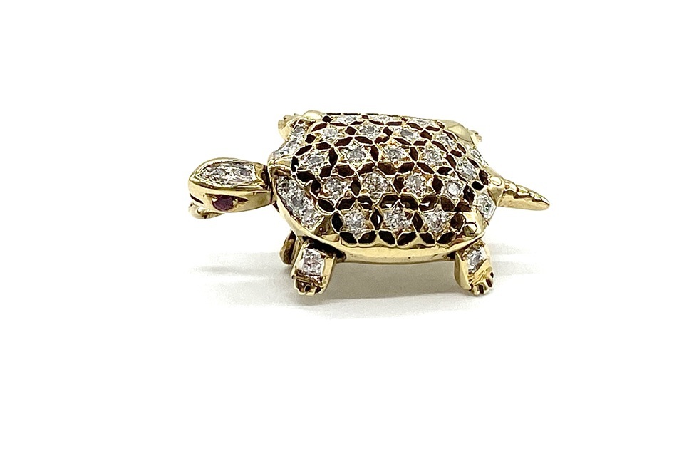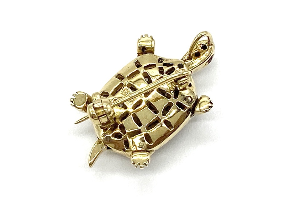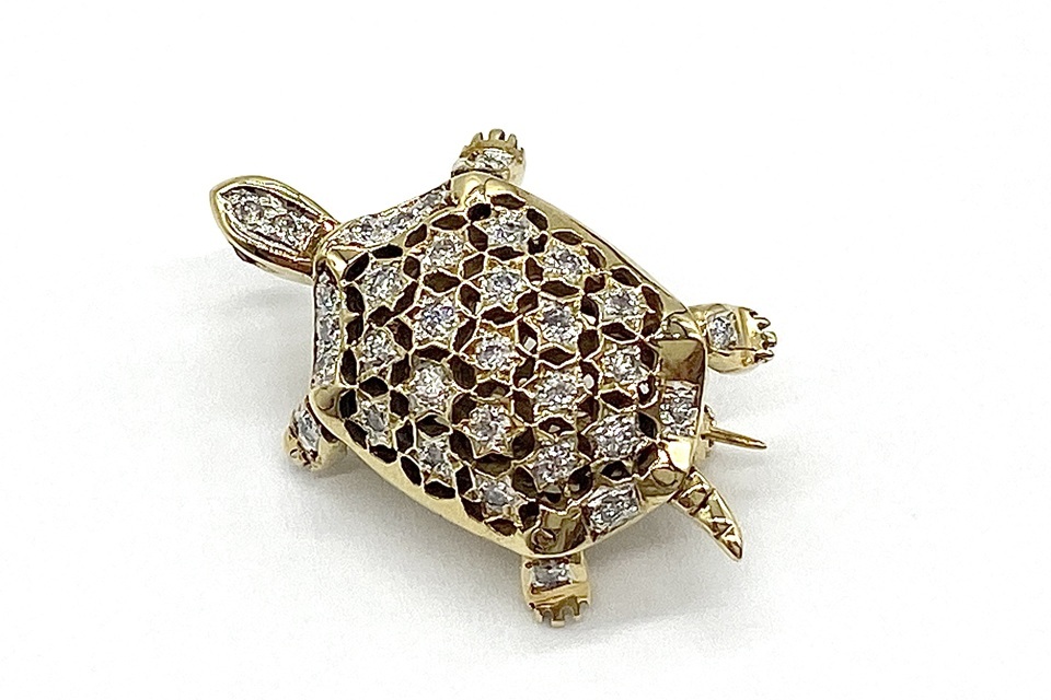 | 解説 | 目にはルビーが輝き、全身を煌めかせつつも、精緻な細工の美しさをも感じさせ、視線を捉えます。甲羅をよく見ると星形を連ねた透かし細工。手足・頭・しっぽが動き、魅力満載の小さな姿が、愛おしくなります・・・慶事の記念やギフトにも◎! |