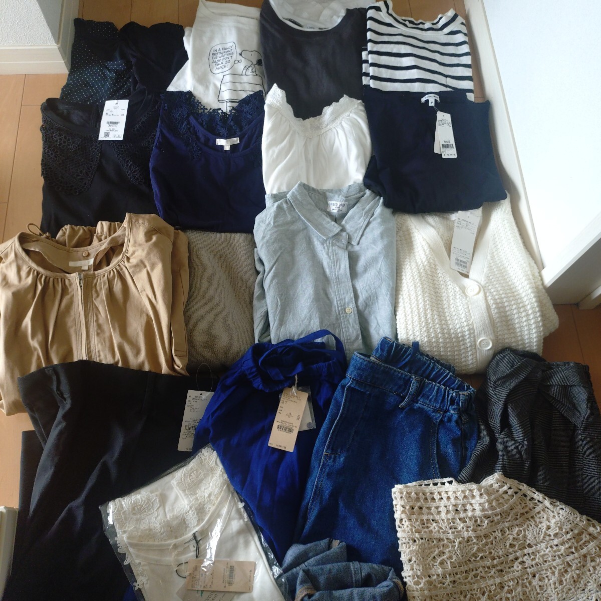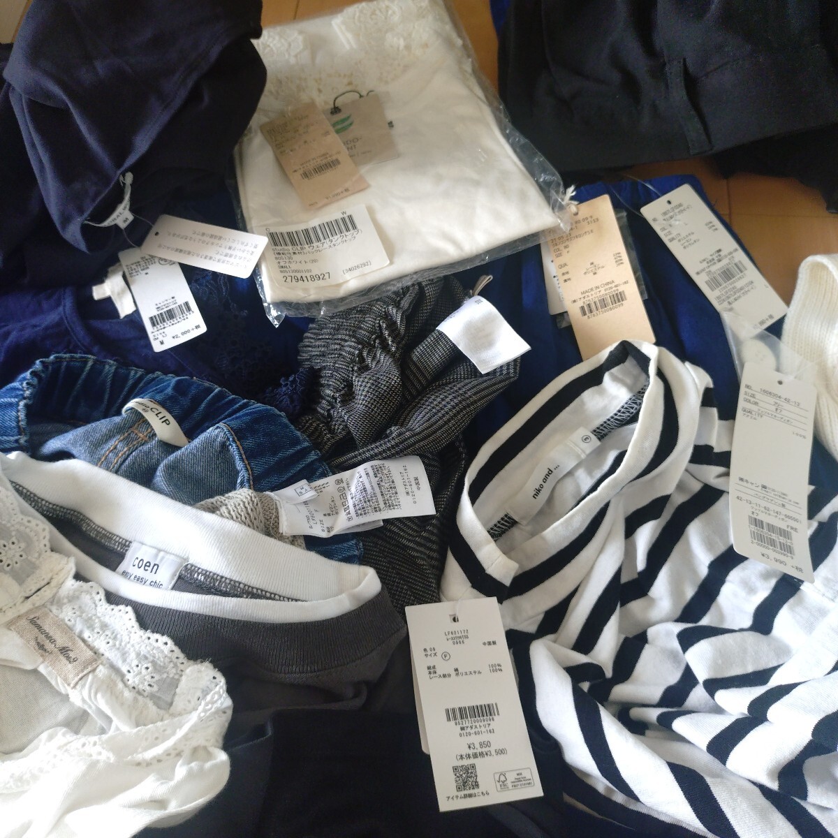 手持ちのお洋服まとめて出品します。写真の物すべてです。М〜Lサイズくらいの方に。アンドエスティが大好きでついつい買いすぎちゃうので、そのブランドが多いです。新品タグ付きから、結構使用しましたがまだまだ着られるよ!というものまで様々です。ブルゾン、カーディガン、半袖Tシャツ、ニット、デニム、スカート、パンツ、インナー、付け襟などなど。不要なものは処分、転売お好きにどうぞ。お安く出品しますので、細かな点気になる方はご遠慮ください。詳細は写真でご確認ください。