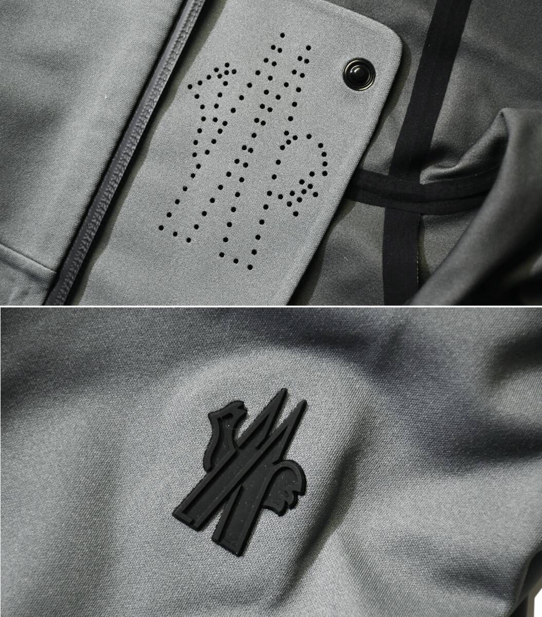 ジップを広げた際にウィンドウストッパーから現れる(チラ見えする)「パンチングロゴ」、 左胸にはモード感漂う「レタリング」、左袖には、ブラックアウトで仕上げた「シリコン製のブランドエンブレム」、 右袖にも、縦に配置した「ロゴプリント」、右袖口のベルクロは、同社のシグネチャーカラー「トリコロールカラーのベルクロ」、 脱いでもガツンと現れる「青/赤であしらったパンチング防水テープのロゴ」、ジップの端には「ロゴ入りのメタルパーツ」、 ストイックなデザインの中にもグルノーブルの個性を明確に刻印。 その他、ジップやボタン等は刻印入りのオリジナル。すべてのパーツにブランドのアイデンティティが息づいています。