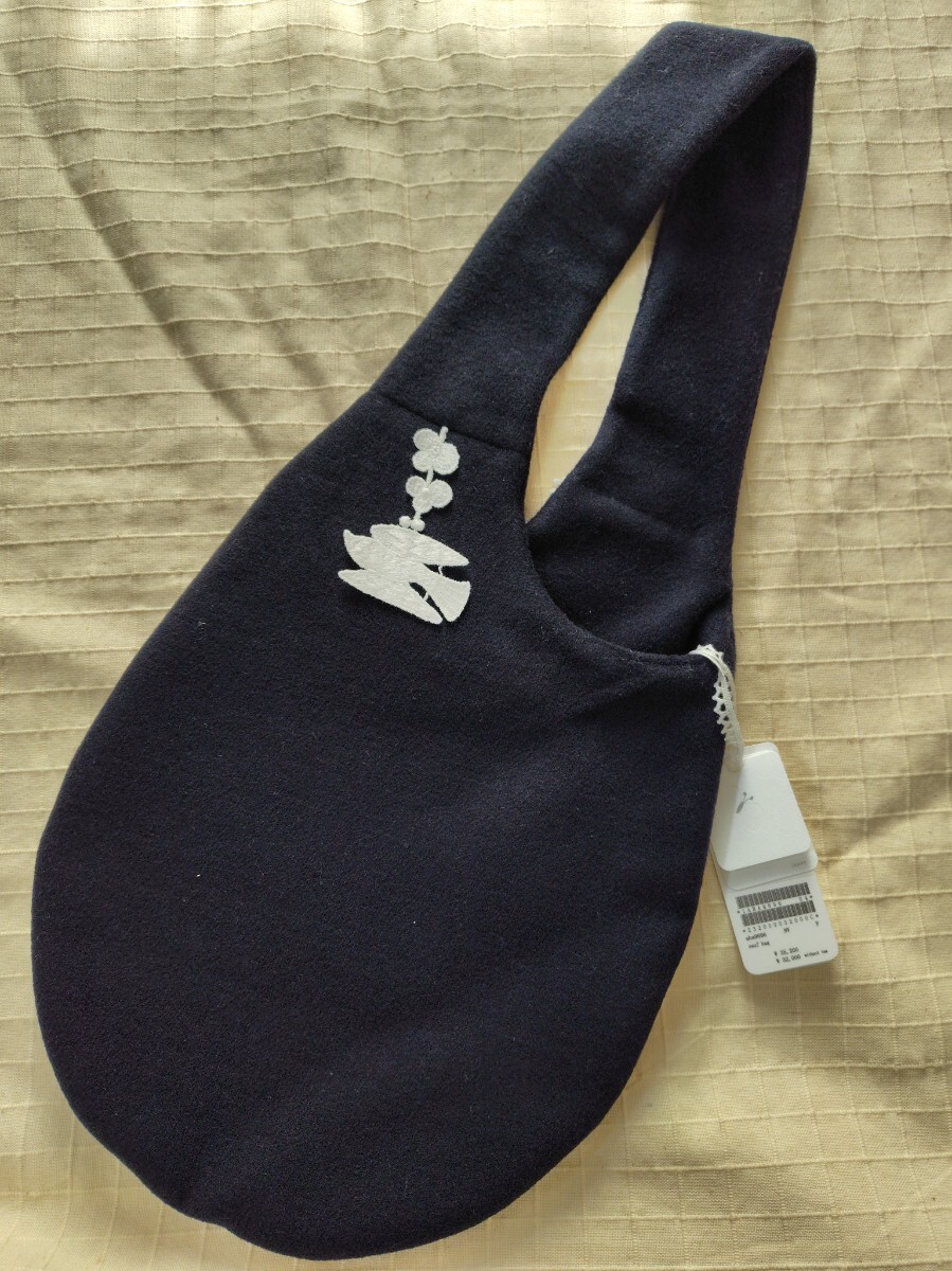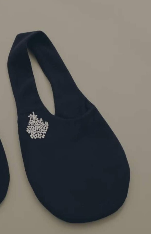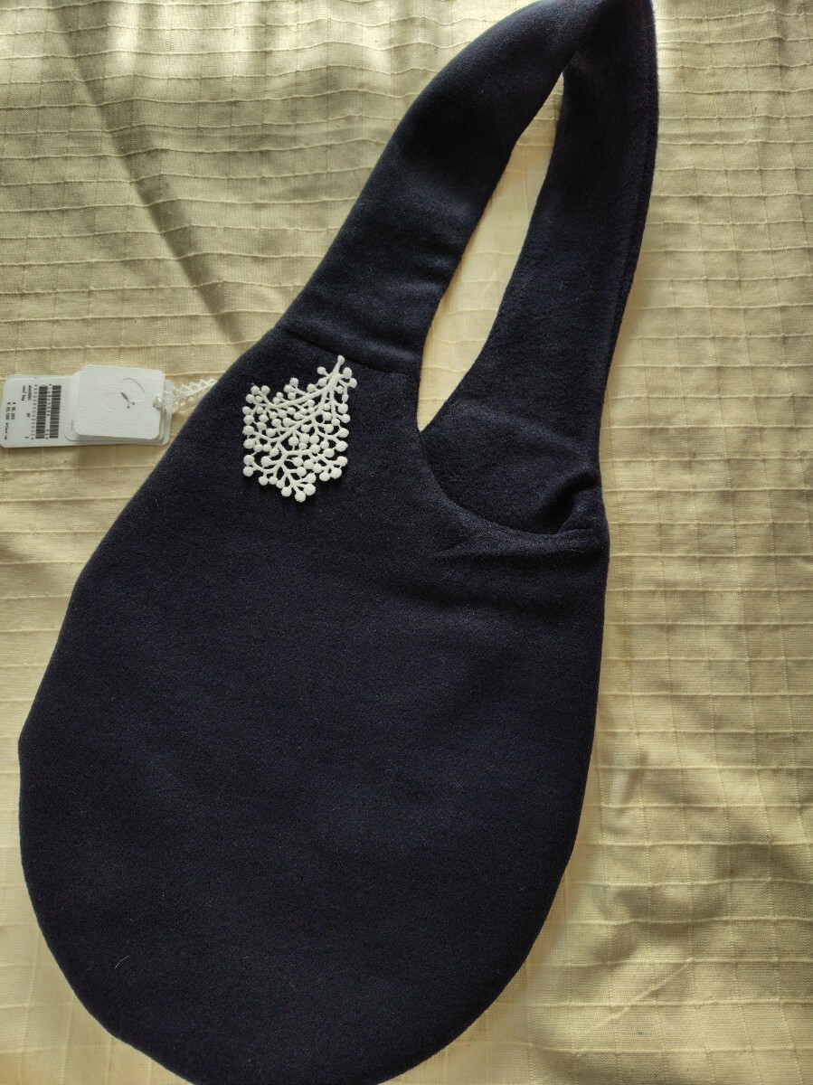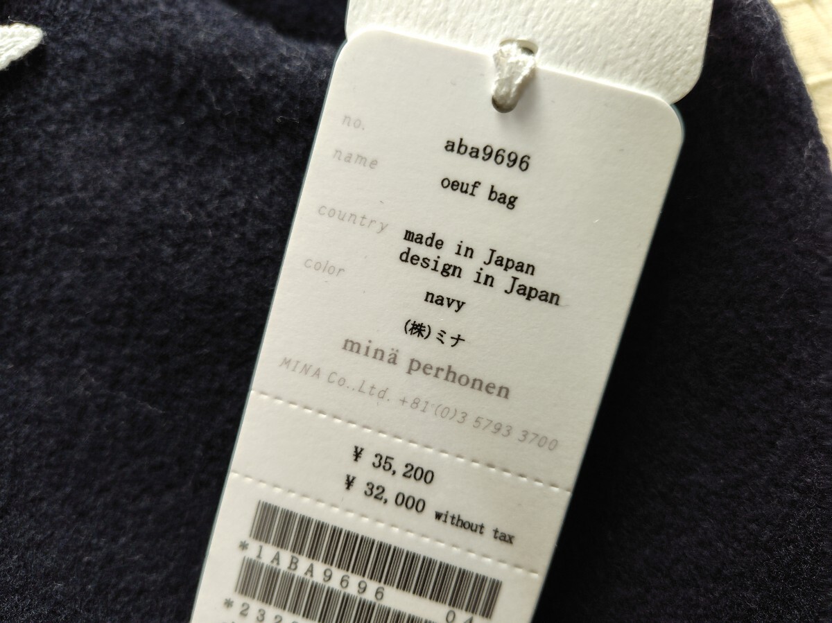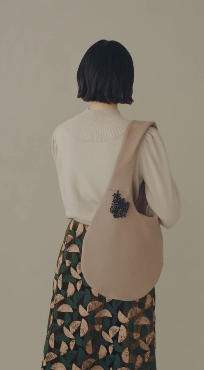 ミナペルホネンのoeufバッグです。本体とハンドルが一続きになったような肩掛けバッグ。肩や腕に掛けた時にも丸いフォルムが崩れないことを目指して作られました。肩に掛けられます。