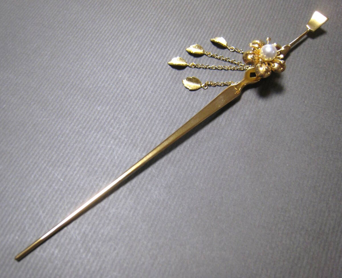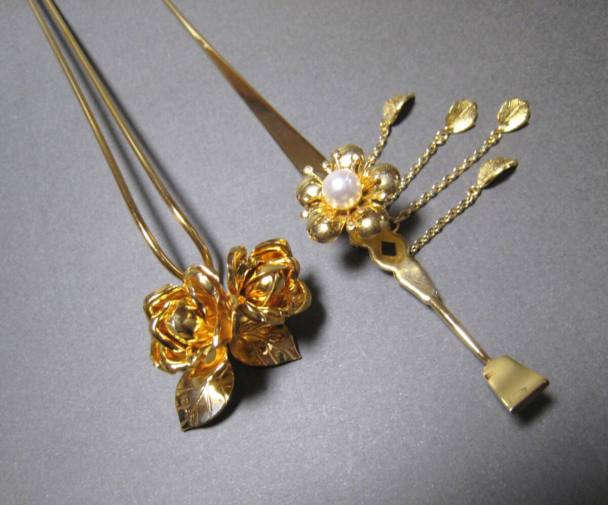 バラ 金色 彫金 チリカン 梅花 パール ビラ飾り 簪 2点 保存品 日本髪 和装 髪飾り かんざし