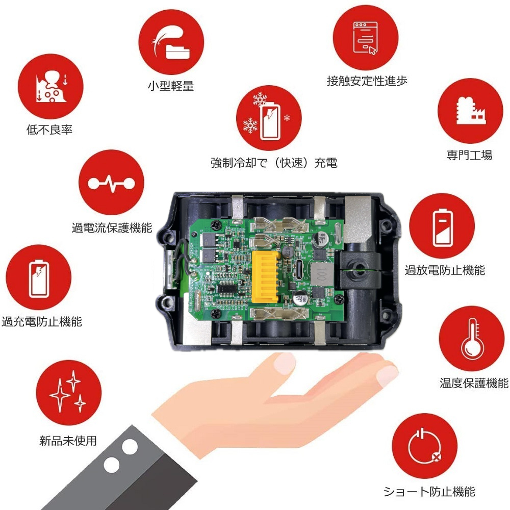 | 商品情報 | 対応メーカー: マキタ ( makita ) 電池種類 : リチウムイオンバッテリー ( Li-ion ) 充電池 着脱方式: スライド式 認証: PSE・CEマーク取得済 製品状態: 新品未使用 保護機能: 過電流、過充電、過放電 充電方法: 充電 方法 は 純正品 と同じ( 純正 ・ 互換 充電器 で 充電 できます) 最新版 高性能精密PCB回路基板使用 タイプCポート付き バッテリーからスマホ・タブレットなどへ充電出来ます。 タイプCケーブルがあればマキタの充電器が無くてもバッテリーへの充電も可能です。 保護回路、過電流保護、過充電防止、過放電防止の保護回路が内蔵されていますので安心して使用できます。 マキタ電動工具 などの 交換用電池 です。 |